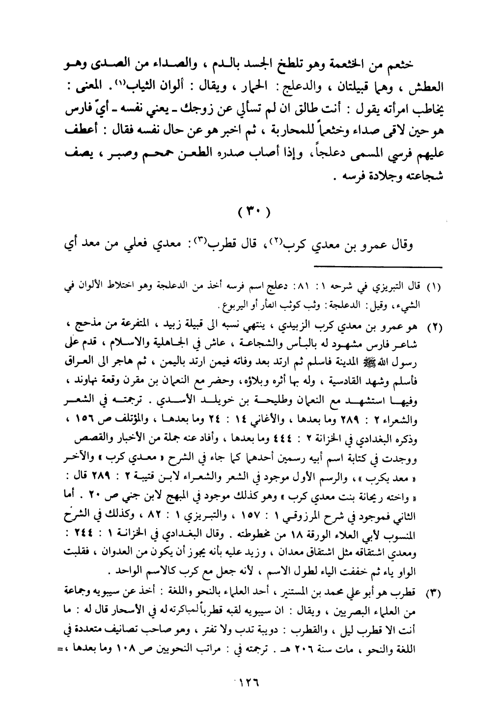 خثعم من الخثعمة وهو تلطخ الجسد بالدم، والصداء من الصدى وهو العطش، وهما قبيلتان، والدعلج: الحمار، ويقال: ألوان الثياب. المعنى: يخاطب امرأته يقول: أنت طالق إن لم تسألي عن زوجك - يعني نفسه - أي فارس هو حين لاقى صداء وخثعمًا للمحاربة، ثم أخبر هو عن حال نفسه فقال: أعطف عليهم فرسي المسمى دعلجًا، وإذا أصاب صدره الطعن حمحم وصبر، يصف شجاعته وجلادة فرسه.