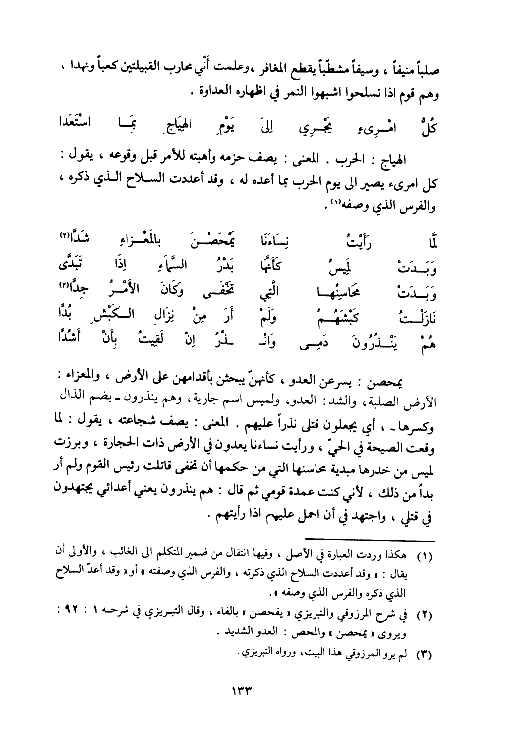 يمحصن: يسرعن العدو، كأنهن يبحثن بأقدامهن على الأرض، والمعزاء: الأرض الصلبة، والشد: العدو، ولميس اسم جارية، وهم ينذرون - بضم الذال وكسرها - أي يجعلون قتلى نذرًا عليهم. المعنى: يصف شجاعته، يقول: لما وقعت الصيحة في الحي، ورأيت نساءنا يعدون في الأرض ذات الحجارة، وبرزت لميس من خدرها مبدية محاسنها التي من حكمها أن تخفي قاتلت رئيس القوم ولم ار بدًا من ذلك، لأني كنت عمدة قومي ثم قال: هم ينذرون يعني أعدائي يجتهدون في قتلي، واجتهد في أن أحمل عليهم إذا رأيتهم.