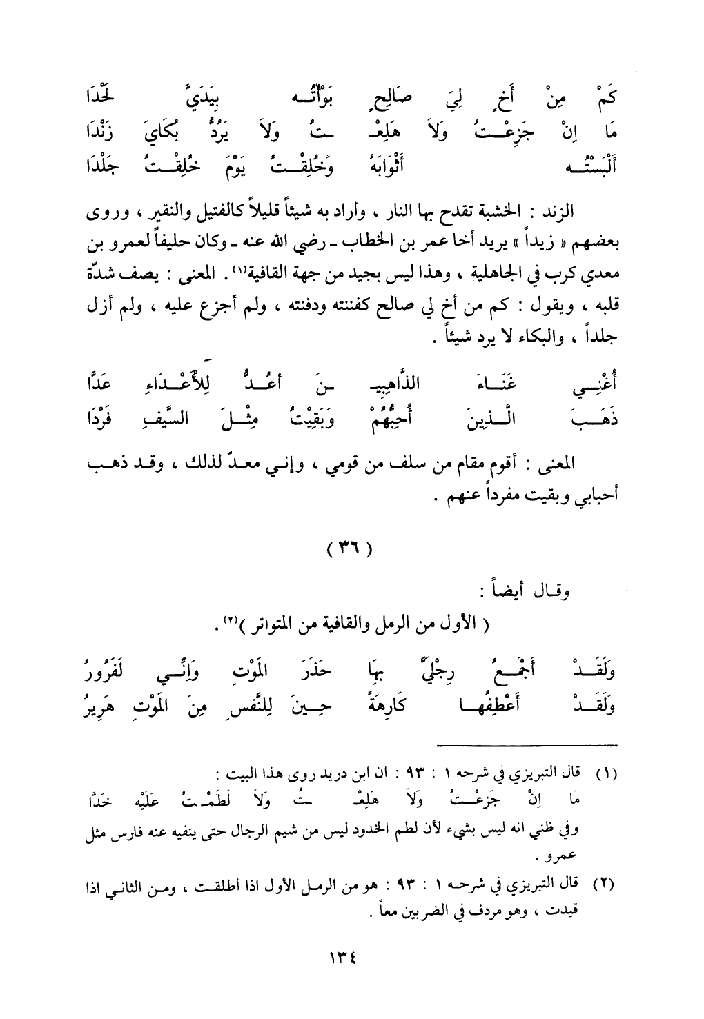 الزند: الخشبة تقدح بها النار، وأراد به شيئًا قليلًا كالفتيل والنقير، وروى بعضهم "زيدًا" يريد أخا عمر بن الخطاب - رضي الله عنه - وكان حليفًا لعمرو بن معدي كرب في الجاهلية، وهذا ليس بجيد من جهة القافية. المعنى: يصف شدة قلبه، ويقول: كم من أخ لي صالح كفنته ودفنته، ولم أجزع عليه، ولم أزل جلدًا، والبكاء لا يرد شيئًا.