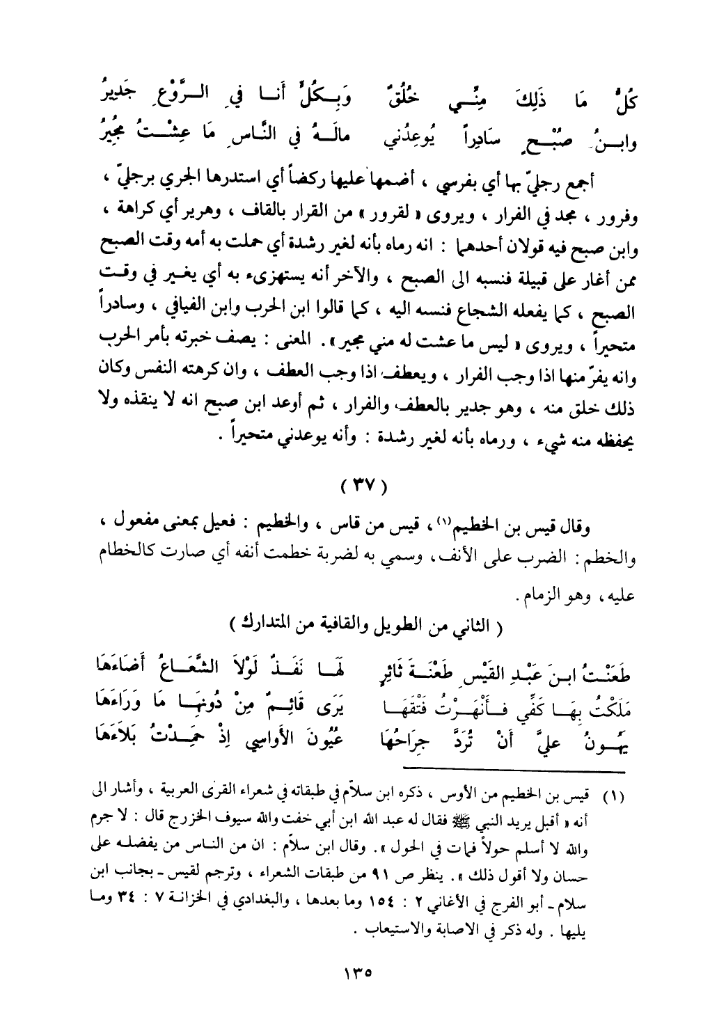 أجمع رجلي بها أي بفرسي، أضمها عليها ركضًا أي استدرها الجري برجلي، وفرور، مجد في الفرار، ويروي "لقرور" من القرار بالقاف، وهرير أي كراهة، وابن صبح فيه قولان أحدهما: أنه رماه بأنه لغير رشدة أي حملت به أمه وقت الصبح ممن غار على قبيلة إلى الصبح، والآخر أنه يستهزئ به أي يغير وقت الصبح، كما يفعله الشجاع فنسه إليه، كما قالوا ابن الحرب وابن الفيافي، وسادرًا متحيرًا، ويروي "ليس ما عشت له مني مجير". المعنى: يصف خبرته بأمر الحرب وأنه يفر منها إذا وجب الفرار، ويعطف إذا وجب العطف، وإن كرهته النفس وكان ذلك خلق منه، وهو جدير بالعطف والفرار، ثم أوعد ابن صبح أنه لا ينقذه ولا يحفظه منه شيء، ورماه بأنه لغير رشدة: وأنه يوعدني متحيرًا.