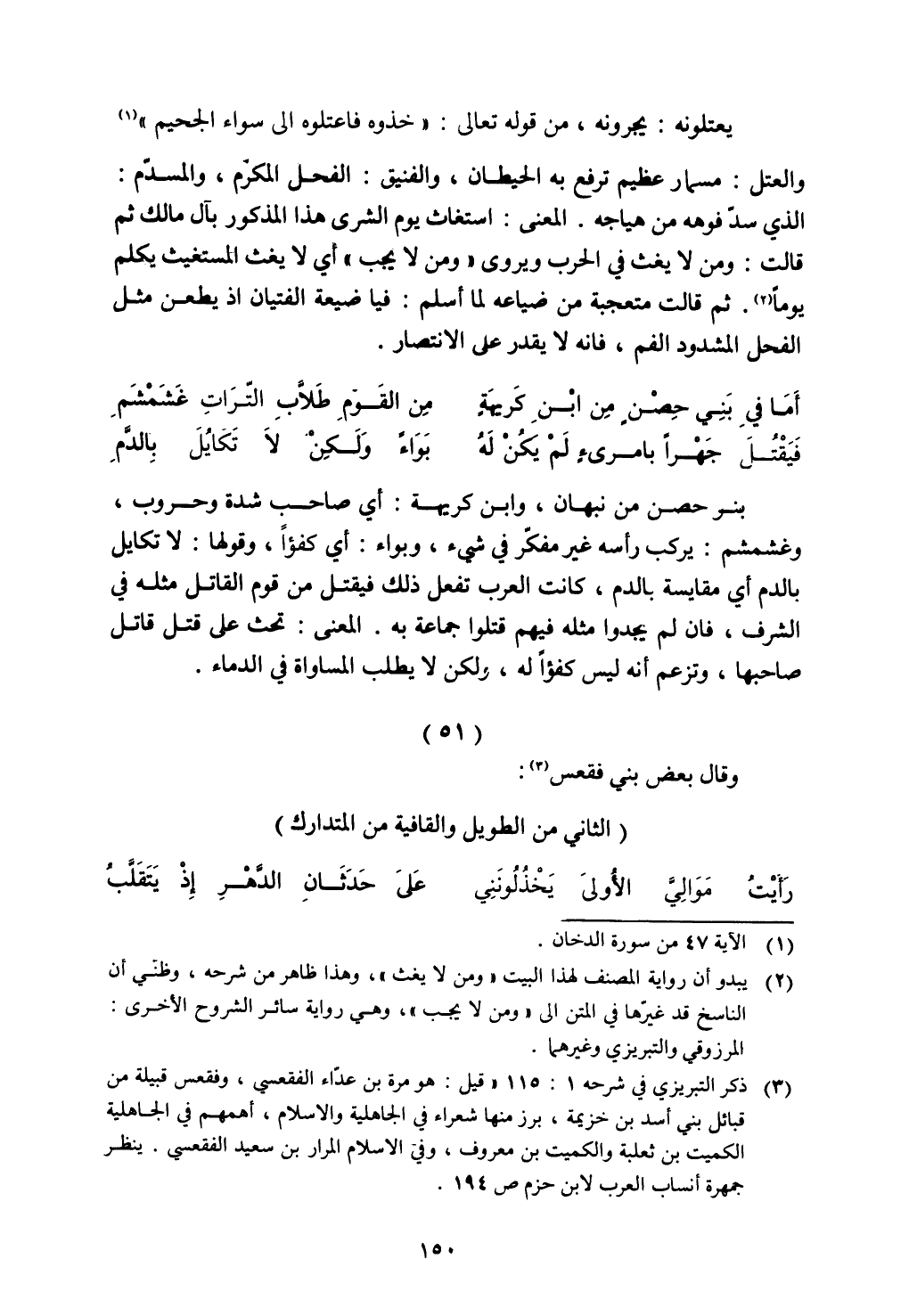 بنو حصن من نبهان، وابن كريهة: أي صاحب شدة وحروب، وغشمشم: يركب رأسه غير مفكر في شيء، وبواء: أي كفؤاً، وقولها: لا تكايل بالدم أي مقايسة بالدم، كانت العرب تفعل ذلك فيقتل من قوم القاتل مثله في الشرف، فإن لم يجدوا مثله فيهم قتلوا جماعة به. المعنى: تحث على قتل قاتل صاحبها، وتزعم أنه ليس كفؤاً له، ولكن لا يطلب المساواة في الدماء.