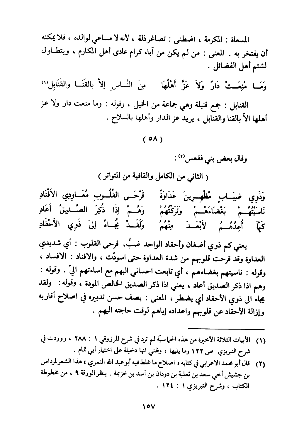 يعني كم ذوي أضغان وأحقاد الواحد ضب، قرص القلوب: أي شديدي العداوة وقد قرحت قلوبهم من شدة العداوة حتى اسودت، والافناد: الافساد، وقوله: ناسيتهم بغضاءهم، أي تابعت احساني إليهم مع اساءتهم إلي. وقوله: وهم إذا ذكر الصديق أعاد، يعني إذا ذكر الصديق الخالص المودة، وقوله: ولقد يجاء إلى ذوي الأحقاد أي يضطر، المعنى: يصف حسن تدبيره في إصلاح أقاربه وإزالة الأحقاد عن قلوبهم وإعداده إياهم لوقت حاجته إليهم.