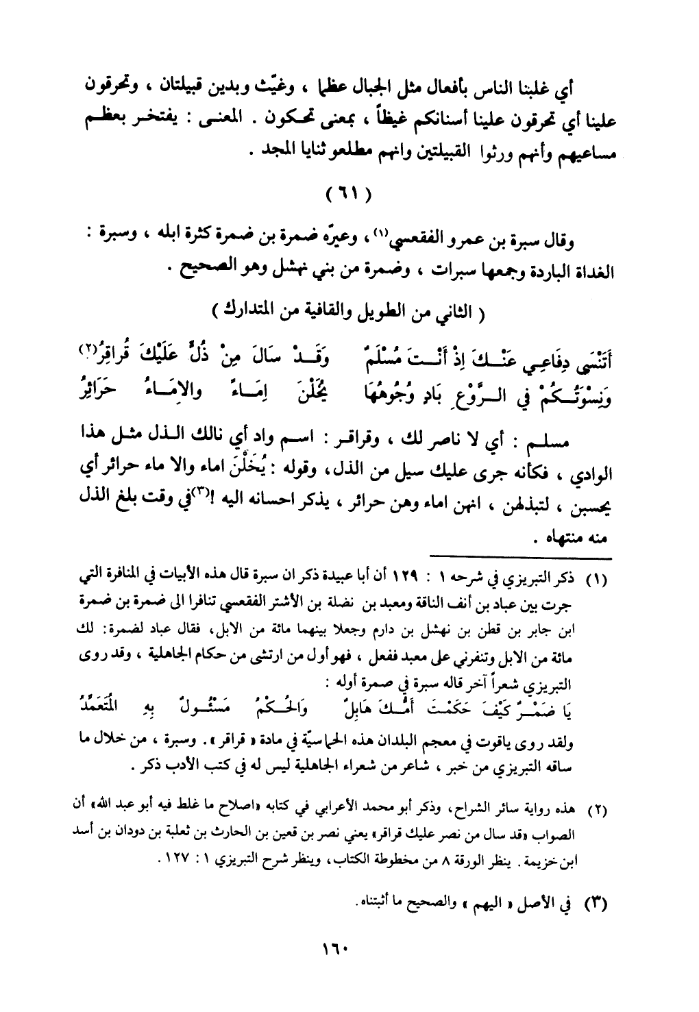 وقال سيرة بن عمرو الفقعسي، وعيره ضمرة بن ضمرة كثرة أبله، وسبرة: الغداة الباردة وجمعها سبرات، وضمرة من بني نهشل وهو الصحيح.