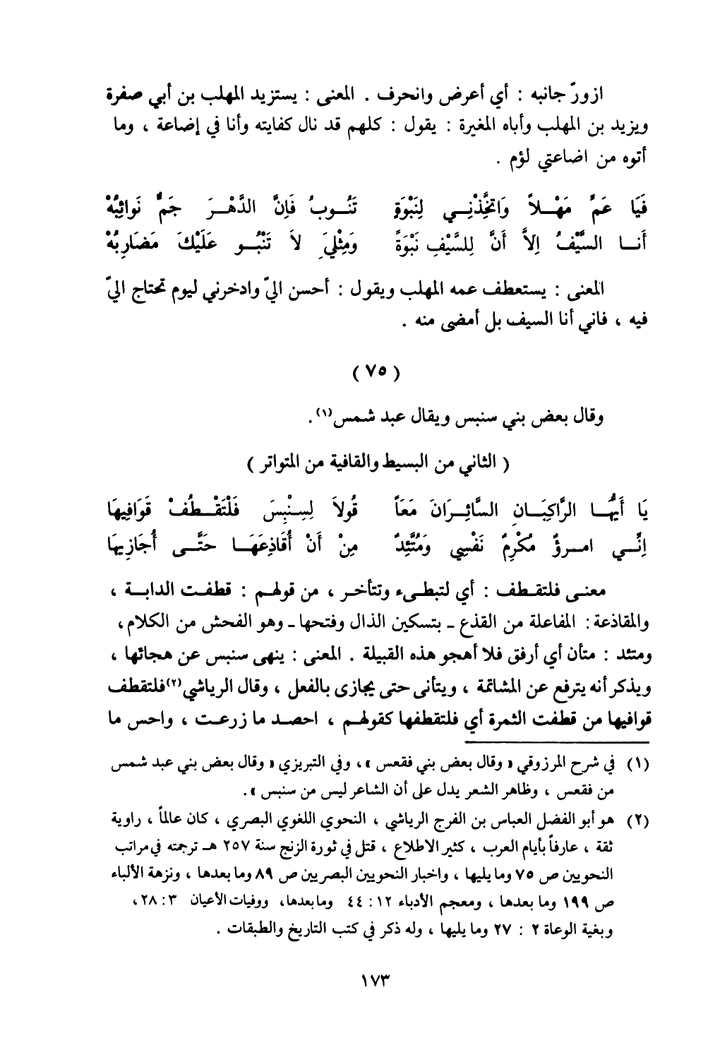 معني فلتقطف: أي لتبطئ وتتأخر، من قولهم: قطفت الدابةوالمقاذعة: المفاعلة من القذع - بتسكين الذال وفتحها - وهو الفحش من الكلام، ومئتد، متأن أي أرفق فلا أهجو هذه القبيلة. المعنى: ينهي سنبس عن هجائها، ويذكر أنه يترفع عن المشاتمة، ويتأنى حتى يجازي بالفعل، وقال الراياشي فلتقطف قوافيها من قطف الثمرة أي فلتقطفها كقولهم، احصد ما زرعت، وأحس ما