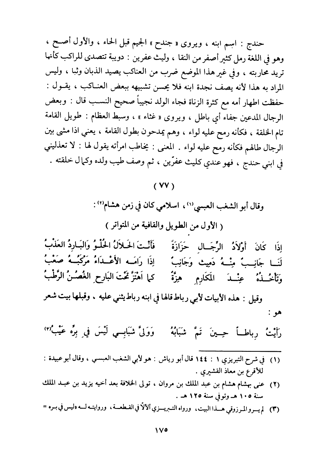 حندج: اسم ابنه، ويروي "جندح" الجيم قبل الحاء، والأول أصح وهو فى اللغة رمل كثير أصفر من النقا، وليث عفرين: دويبة تتصدى للرامب كأنها تريد محاربته، وفى غير هذا الموضع ضرب من العناكب يصيد الذبان وثبا، وليس المراد به هذا لأنه يصف نجدة ابنه فلا يحسن تشبيهه ببعض العناكب، يقول حفظت إطهار أمه مع كثرة الزناة فجاء الولد نجيباً صحيح النسب قال: وبعض الرجال المدعين جفاء أي باطل، ويروي "غثاء"، وسبط العظام: طويل القامة تام الخلقة، فكأنه رمح عليه لواء، وهم يمدحون بطول القامة، يعني إذا مشى بين الرجال طالهم فكأنه رمح عليه لواء. المعنى: يخاطب امرأته يقول لها: لا تعذليني فى ابني حندج، فهو عندي كليث عفرين، ثم وصف طيب ولده وكمال خلقته.
