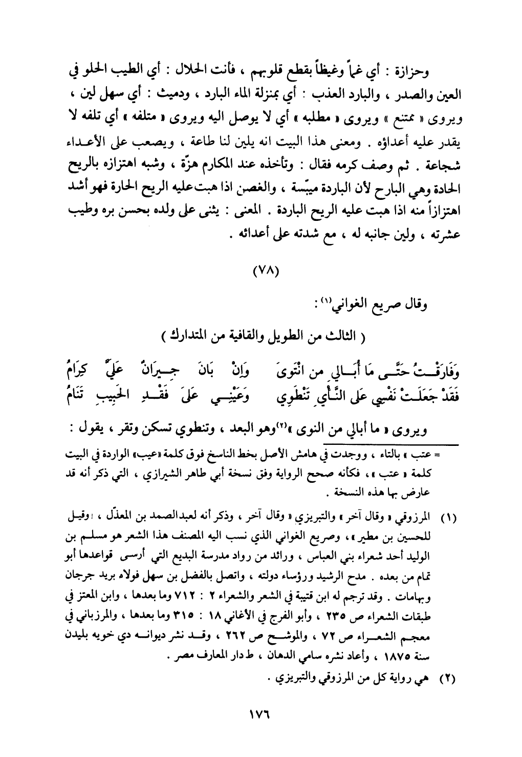 وحزازة: أي غماً وغيظً بقطع قلوبهم، فأنت الحلال: أي الطيب الحلو فى العين والصدر، والبارد العذب: أي بمنزلة الماء البارد، ودميث: أي سهل لين، ويروي "ممتنع" ويروي "مطلبه" أي لا يوصل إليه ويروي "متلفه" أي تلفه لا يقدر عليه أعداؤه ومعنى هذا البيت أنه يلين لنا طاعة، ويصعب على الأعداء شجاعة ثو وصف كرمه فقال: وتأخذه عند المكارم هزة، وشبه اهتزازه بالريح الحادة وهي البارح لأن الباردة ميبسة، والغصن إذا هبت عليه الريح الباردة المعنى: يثني على ولده بحسن بره وطيب عشرته، ولين جانبه له، مع شدته على أعدائه