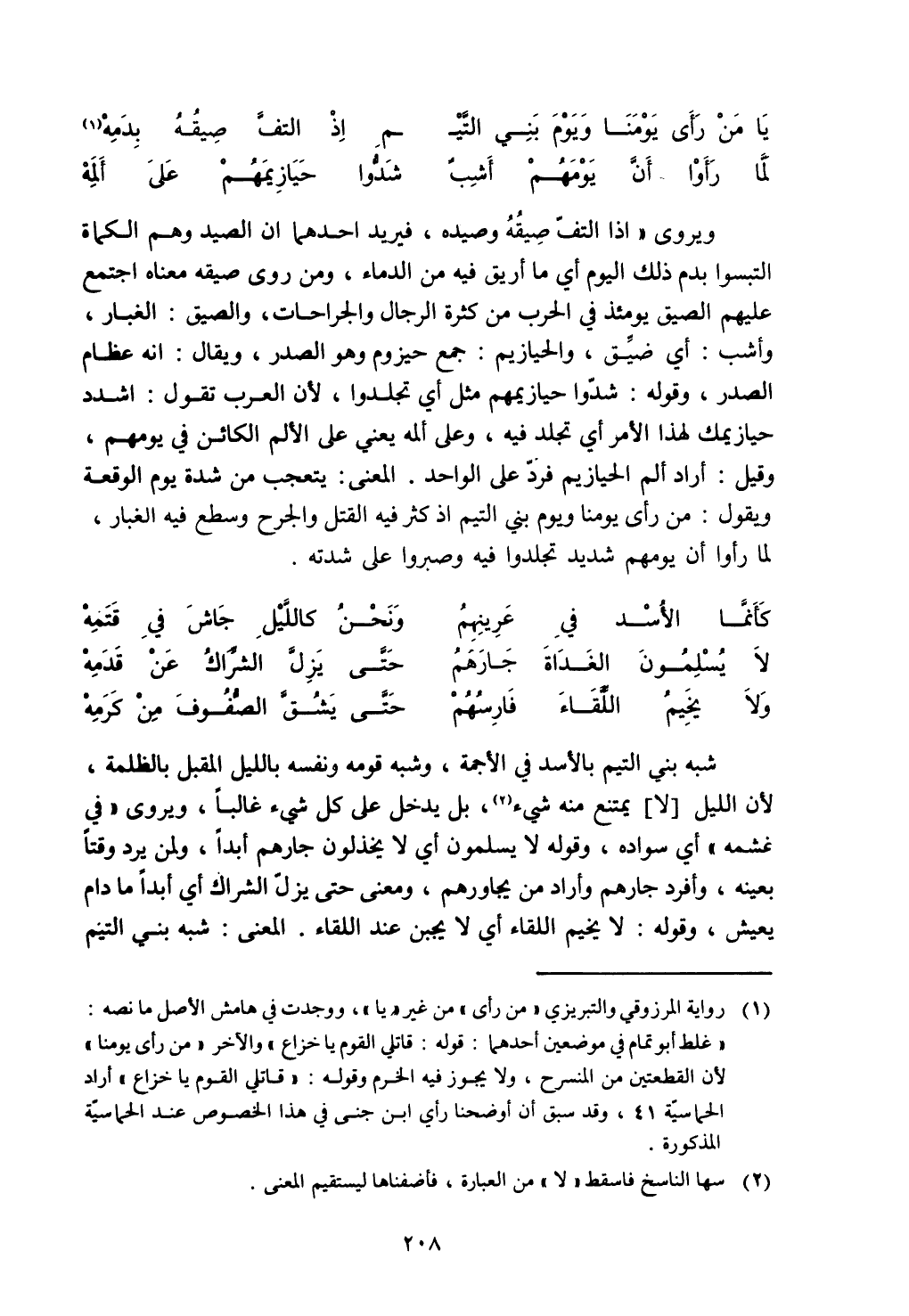 ويروى "اذا التف صيقه وصيده، فيريد احدهما ان الصيد وهم الكماة التبسوا بدم ذلك اليوم رأي ما أريق فيه من الدماء، ومن روى صيقه معناه اجتمع عليهم الصيق يومئذ في الحرب من كثرة الرجال والجراحات، والصيق: الغبار، وأشب: أي ضيق، والحيازيم: جمع حيزوم وهو الصدر، ويقال: انه عظام الصدر، وقوله: شدوا حيازيمهم مثل أي تجلدوا، لأن العرب تقول: اشدد حيازيمك لهذا الأمر أي تجلد فيه، وعلى ألمه يعني على الألم الكائن في يومهم، وقيل: أراد ألم الحيازيم فرد على الواحد. المعنى: يتعجب من شدة يوم الوقعة ويقول: من رأى يومنا ويوم بني التيم اذ كثر فيه القتل والجرح وسطغ فيه الغبار، لما رأوا أن يومهم شديد تجلدوا فيه وصبروا على شدته.