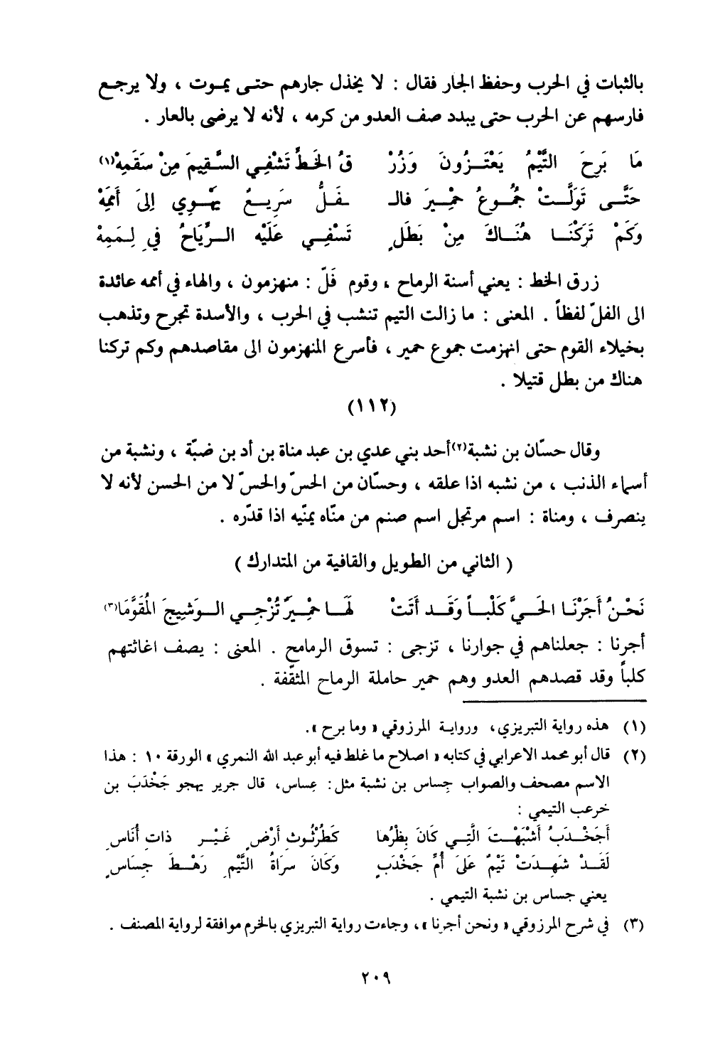 وقال حسان بن نشبة أحد بني عدي بن عبد مناة بن أد بن ضبة، ونشبة من أسماء الذنب، من نشبه إذا علقه، وحسان من الحس والحس لا من الحسن لأنه لا ينصرف، ومناة: اسم مرتجل اسم صنم من مناه يمنيه إذا قدره.