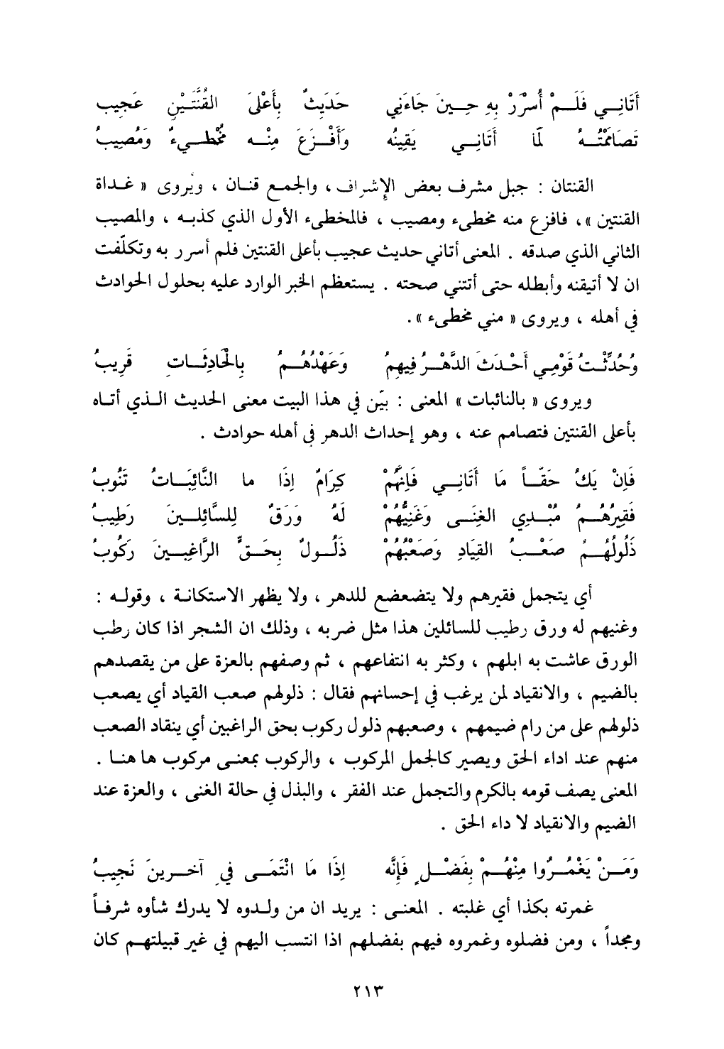 أي يتجمل فقيرهم ولا يتضعضع للدهر، ولا يظهر الاستكانة، وقوله: وغنيهم له ورق رطيب للسائلين هذا مثل ضربه، وذلك أن الشجر إذا كان رطب الورق عاشت به إبلهم، وكثر به انتفاعهم، ثم وصفهم بالعزة على من يقصدهم بالضيم، والانقياد لمن يرغب في إحسانهم فقال: ذلولهم صعب القياد أي يصعب ذلولهم على من رام ضيمهم، وصعبهم ذلول ركوب بحق الراغبين أي ينقاد الصعب منهم عند أداء الحق ويصير كالجمل المركوب، والركوب بمعنى مركوب ها هنا. المعنى يصف قومه بالكرم والتجمل عند الفقر، والبذل في حالة الغنى، والعزة عند الضيم والانقياد لا داء الحق.
