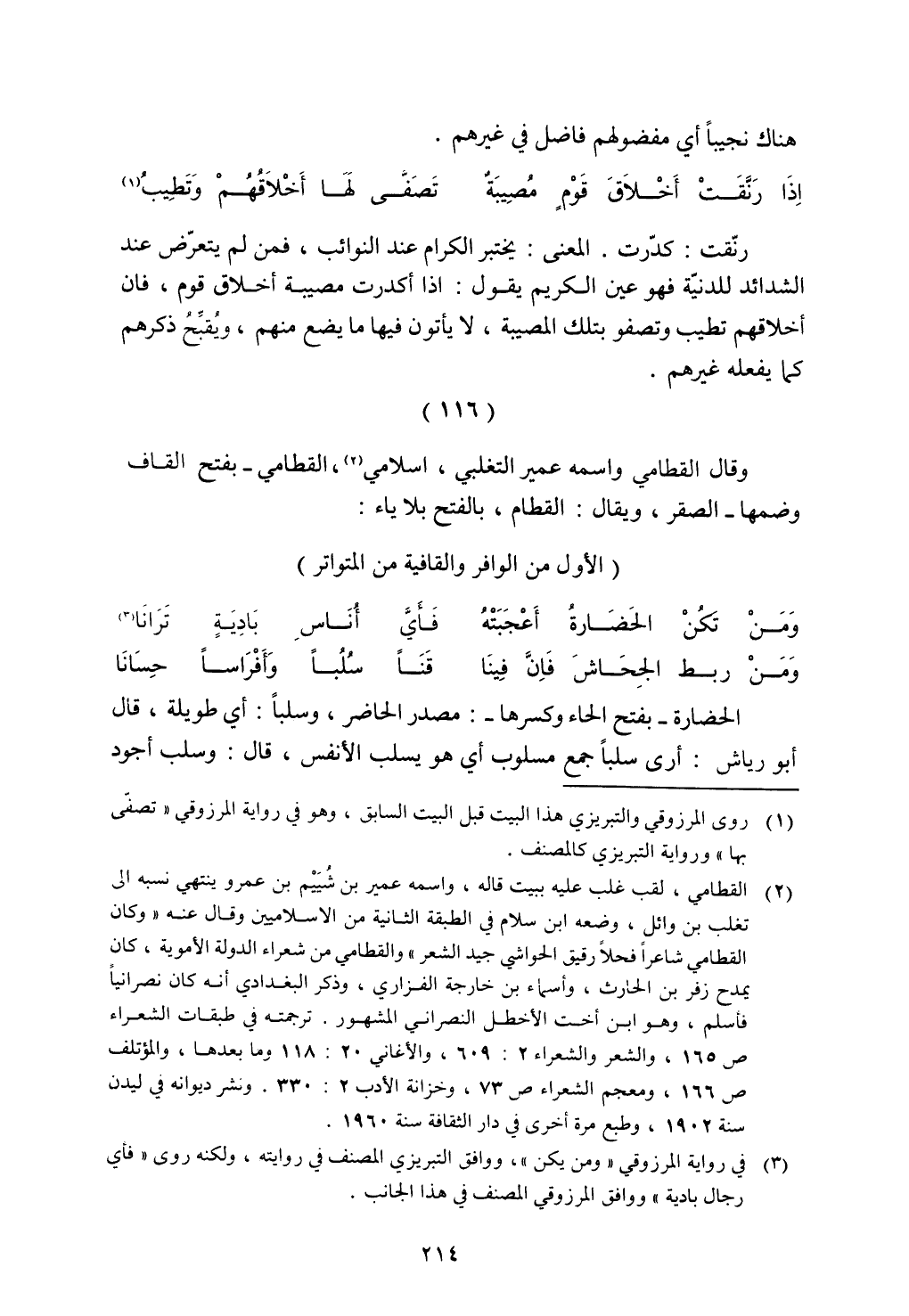وقال القطامي واسمه عمير التغلبي، إسلامي، القطامي- بفتح القاف وضمها- الصقر، ويقال: القطام، بالفتح بلا ياء: