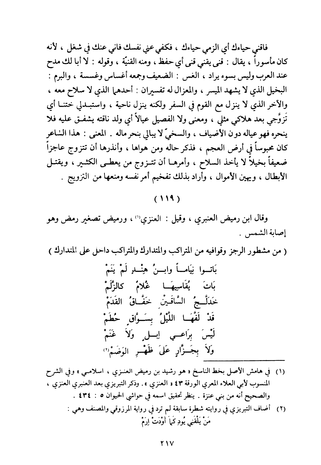 فاقني حياءك أي ألزمي حياءك، فكفي عني نفسك فإني عنك في شغل، لأنه كان مأسورًا، يقال: قني يقنى قني أي حفظ، ومنه القنية، وقوله: لا أبا لك مدح عند العرب وليس بسوء يراد، الغس: الضعيف وجمعه أغساس وغسسة، والبرم: البخيل الذي لا يشهد الميسر، والمعزال له تفسيران: أحدهما الذي لا سلاح معه، والاخر الذي لا ينزل مع القوم في السفر ولكنه ينزل ناحية، واستبدلي ختنا أي تزوجي بعد هلاكي مثلي، ومعنى ولا الفصيل عيالاً أي ولد ناقته يشفق عليه فلا ينحره فهو عياله دون الأضياف، والسخي لا يبالي بنحر ماله. المعنى: هذا الشاعر كان محبوسًا في أرض العجم، فذكر حاله ومن هواها، وأنذرها أن تتزوج عاجزًا ضعيفًا بخيلاً لا يأخذ السلاح، وأمرها أن تتزوج من يعطي الكثير، ويقتل الأبطال، ويهين الأموال، وأراد بذلك تفخيم أمر نفسه ومنعها من التزويج.