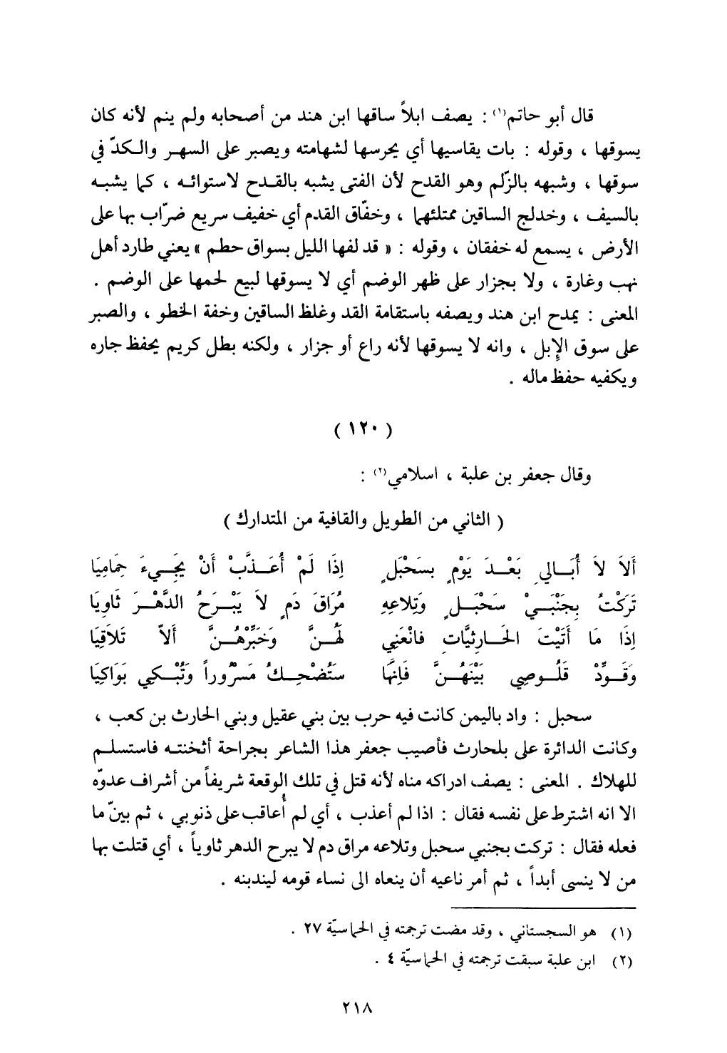 سحبل: واد باليمن كانت فيه حرب بين بني عقيل وبني الحارث بن كعب، وكانت الدائرة على بلحارث فأصيب جعفر هذا الشاعر بجراحة أثخنته فاستسلم للهلاك. المعنى: يصف إدراكه مناه لأنه قتل في تلك الوقعة شريفًا من أشراف عدوه إلا أنه اشترط على نفسه فقال: إذا لم أعذب، أي لم أعاقب على ذنوبي، ثم بين ما فعله فقال: تركت بجنبي سحبل وتلاعه مراق دم لا يبرح الدهر ثاويًا، أي قتلت بها من لا ينسى أبدًا، ثم أمر ناعيه أن ينعاه إلى نساء قومه ليندبنه.