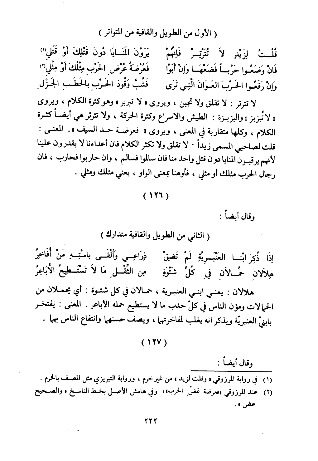 لا تترتر: لا تقلق ولا تجبن، ويروى "لا تبربر" وهو كثرة الكلام، ويروى "لا تبزبز" والبزبزة: الطيش والإسراع وكثرة الحركة، ولا تثرثر هي أيضاً كثرة الكلام، وكلها متقاربة في المعنى، ويروى "فعرضة حد السيف". المعنى: قلت لصاحبي المسمى زيداً. لا تقلق ولا تكثر فإن أعداءنا لا يقدرون علينا لأنهم يرقبون المنايا دون قتل واحد منا فإن سالموا فسالم، وإن حاربوا فحارب، فإن رجال الحرب مثلك أو مثلي، فأوهنا بمعنى الواو، يعني مثلك ومثلي.