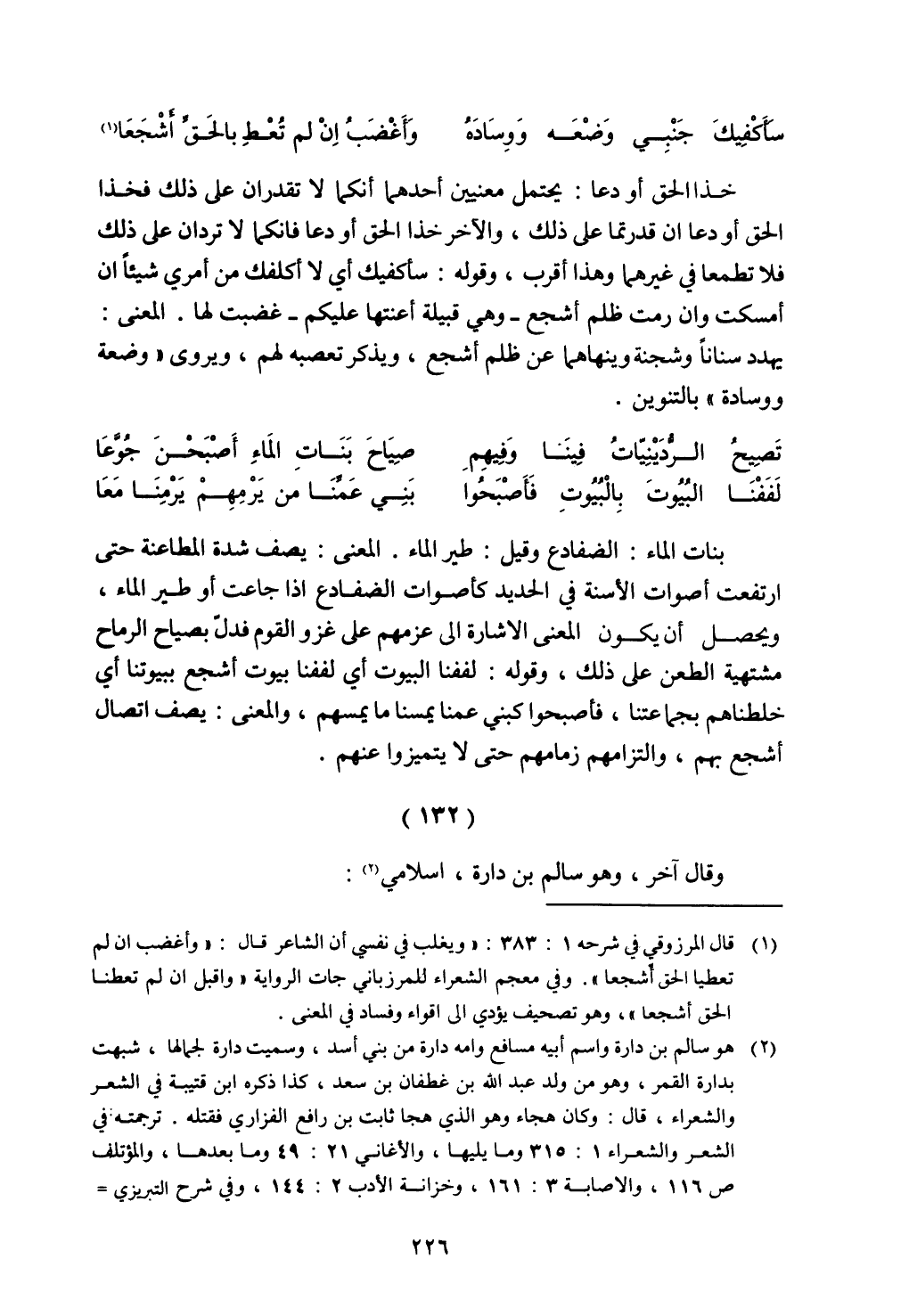 خذا الحق أو دعا: يحتمل معنيين أحدهما أنكما لا تقدران على ذلك فخذا الحق أو دعا إن قدرتما على ذلك، والآخر خذا الحق أو دعا فإنكما لا تردان على ذلك فلا تطمعا في غيرهما وهذا أقرب، وقوله: سأكفيك أي لا أكلفك من أمري شيئا إن أمسكت وإن رمت ظلم أشجع -وهي قبيلة أعنتها عليكم- غضبت لها. المعنى: يهدد سنانا وشجنة وينهاهما عن ظلم أشجع، ويذكر تعصبه لهم، ويروى "وضعة ووسادة بالتنوين".