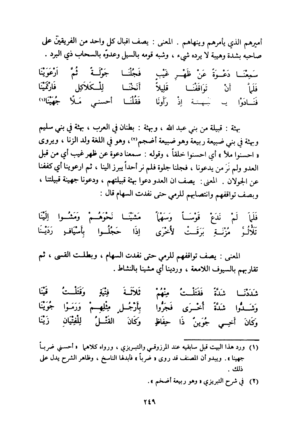بهثة: قبيلة من بني عبد الله، وبهثة: بطنان في العرب، بهثة في بني سليم وبهثة في بني ضبيعة ربيعة وهو ضبيعة أضجم، وهو في الغة ولد الزنا، ويروى "أحسنوا ملأ" أي أحسنوا خلقًا، وقوله: سمعنا دعوة عن ظهر غيب أي من قبل العدو ولم نر من يدعونا، فجلنا جلوة فلم نر أحدًا يبرز إلينا، ثم ارعونا أي كففنا عن الجولان. المعنى: يصف أن العدو دعوا بهثة قبيلتهم، ودعونا جهينة قبيلتنا، وبصف تواقفهم وانتصابهم للرمي حتى نفدت السهام قال: