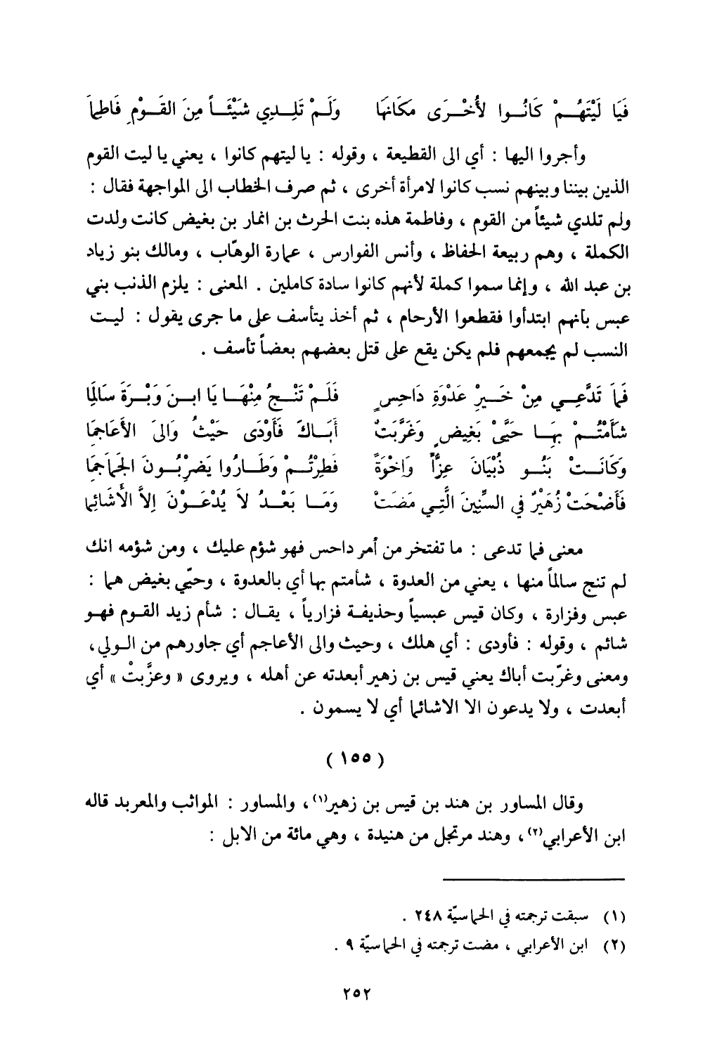 وأجروا إليها: أي إلى القطيعة، وقوله: يا ليتهم كانوا، يعني يا ليت القوم الذين بيننا وبينهم نسب كانوا لامرأة أخرى، ثم صرف الخطاب إلى المواجهة فقال: ولم تلدي شيئًا من القوم، وفاطمة هذه بنت الحرث بن انمار بن بغيض كانت ولدت الكملة، وهم ربيعة الحفاظ، وأنس الفوارس، عمارة الوهاب، ومالك بنو زياد بن عبد الله، وإنما سموا كملة لأنهم كانوا سادة كاملين. المعنى: يلزم الذنب بني عبس بأنهم ابتدءوا فقطعوا الأرحام، ثم أخذ يتأسف على ما جرى يقول: ليت النسب لم يجمعهم فلم يكن يقع على قتل بعضهم بعضًا تأسف.