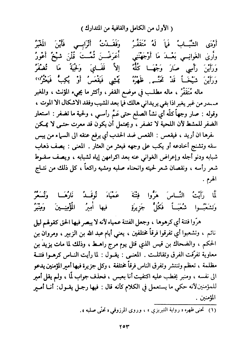 هروا فتنة أي كرهوها، وجعل الفتنة عمياء لأنه لا يبصر فيها الحق كقولهم ليل نائم، وتشعبوا أي تفرقوا فرقًا مختلفين، يعني أيام عبد الله بن الزبير، ومروان بن الحكم، والضحاك بن قيس الذي قتل يوم مرج راهط، وذلك لما مات يزيد بن معاوية تفرقت الفرق وتقاتلت. المعنى: يقول: لما رأيت الناس كرهوا فتنة مظلمة، تعظم وتنتشر وتفرق الناس فرقًا الناس فرقًا مختلفة، وكل جزيرة فيها أمير المؤمنين يدعو إلى نفسه، ومنبر يخطب عليه اكتفيت أنا بعبس، فحذف جواب لما، ولم يقل أمير للمؤمنين لأنه حكي ما يستعمل في الكلام كأنه قال: فيها رجل يقول: أنا أمير المؤمنين.