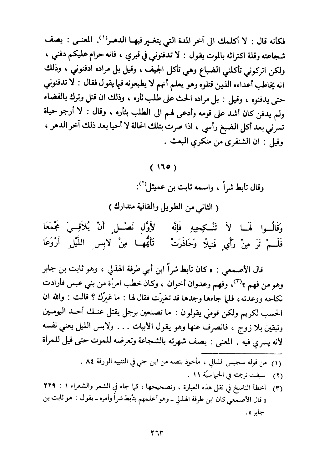 فكأنه قال: لا أكلمك إلى آخر المدة التي يتغير فيها الدهر. المعنى: يصف شجاعته وقلت اكتراثه بالموت يقول: لا تدفنوني في قبري، فإنه حرام عليكم دفني، ولكن اتركوني تأكلني الضباع وهي تأكل الجيف، وقيل بل مراده ادفنوني، وذلك إنه يخاطب أعداءه الذين قتلوه وهو يعلم أنهم لا يطيعونه فيما يقول فقال: لا تدفنوني حتى يدفنوه، وقيل: بل مراده الحث على طلب ثأره، وذلك إن قتل وترك بالفضاء ولم يدفن كأن أشد على قومه وادعى لهم إلى الطلب بثأره، وقال: لا أرجو حياة تسرني بعد أكل الضبع رأسي، إذا صرت بتلك الحالة لا أحيا بعد ذلك آخر الدهر، وقيل: إن الشنفرى من منكري البعث.