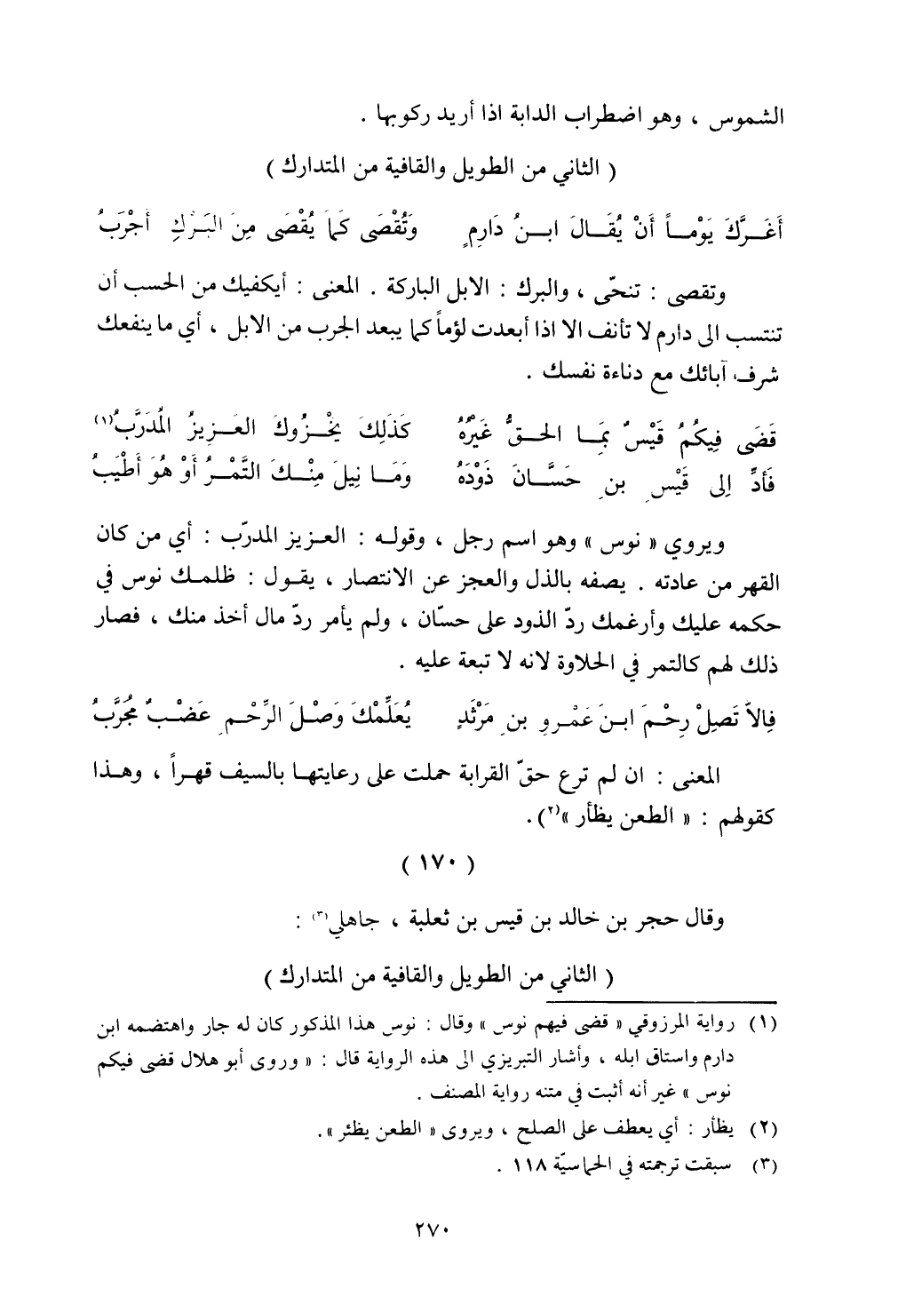 وتقصى: تنحى، والبرك: الإبل الباركة. المعنى: أيكفيك من الحسب أن تنتسب إلى دارم لا تأنف إلا إذا أبعدت لؤمًا كما يبعد الجرب من الإبل، أي ما ينفعك شرف آبائك مع دناءة نفسك.