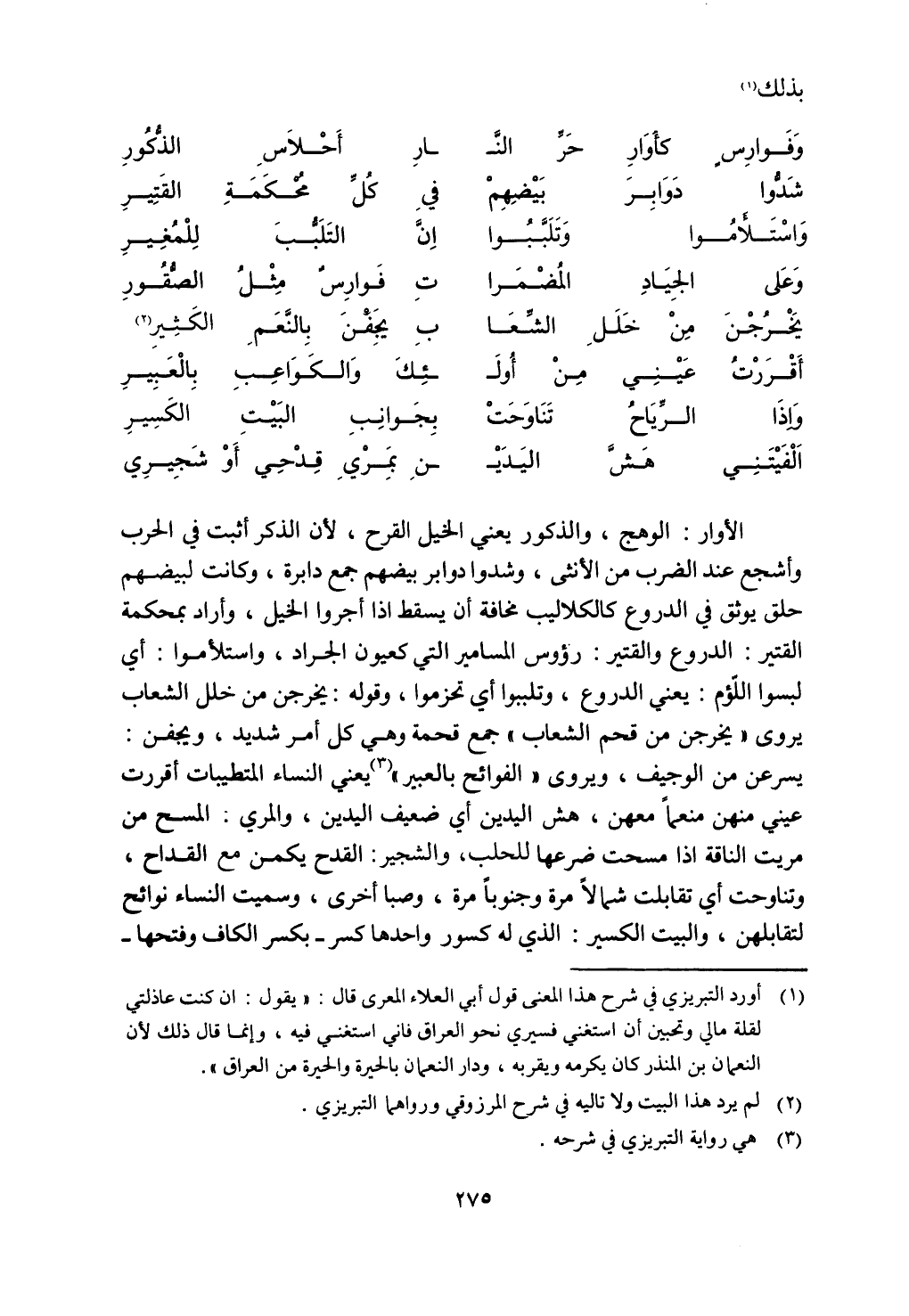 الأوار: الوهج، والذكور يعني الخيل القرح، لأن الذكر أثبت في الحرب وأشجع عند الضرب من الأنثى، وشدوا دوابر بيضهم جمع دابرة، وكانت لبيضهم حلق يوثق في الدروع كالكلاليب مخافة أن يسقط إذا أجروا الخيل، وأراد بمحكمة القتير: الدروع والقتير: رؤوس المسامير التي كعيون الجراد، واستلأموا: أي لبسوا اللؤم: يعني الدروع، وتلببوا أي تحزموا، وقوله: يخرجن من خلل الشعاب يروي "يخرجن من قحم الشعاب" جمع قحمة وهي كل أمر شديد، ويجفن: يسرعن من الوجيف، ويروي "الفوائح بالعبير" يعني النساء المتطيبات أقررت عيني منهن منعمًا معهن، هش اليدين أي ضعيف اليدين، والمري: المسح من مريت الناقة إذا مسحت ضرعها للحلب، والشجير: القدح يكمن مع القداح، وتناوحت أي تقابلت شمالًا مرة وجنوبًا مرة، وصبا أخرى، وسميت النساء نوائح لتقابلهن، والبيت الكسير: الذي له كسور واحدها كسر- بكسر الكاف وفتحها-