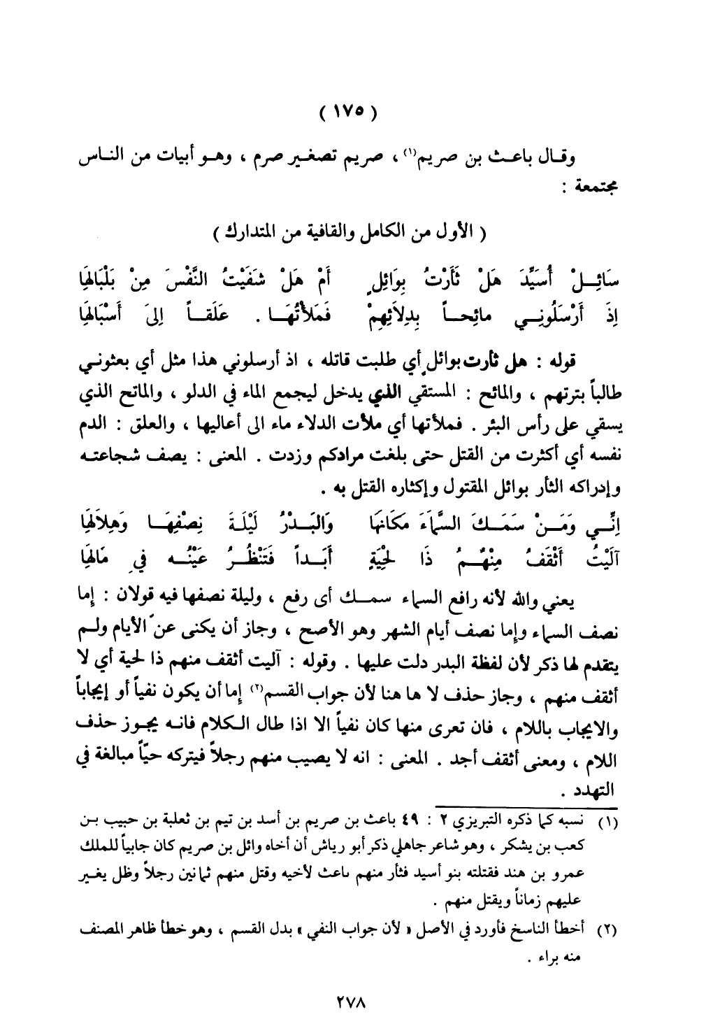 قوله: هل ثأرت بوائٍل أي طلبت قاتله، إذ أرسلوني هذا مثل أي بعثوني طالبًا بترتهم، والمائح: المستقي الذي يدخل ليجمع الماء في الدلو، والمانح الذي يسقي على رأس البئر. فملأتها أي ملأت الدلاء ماء إلى أعاليها، والعلق: الدم نفسه أي أكثرت من القتل حتى بلغت مرادكم وزدت. المعنى: يصف شجاعته وإدراكه الثأر بوائل المقتول وإكثاره القتل به.