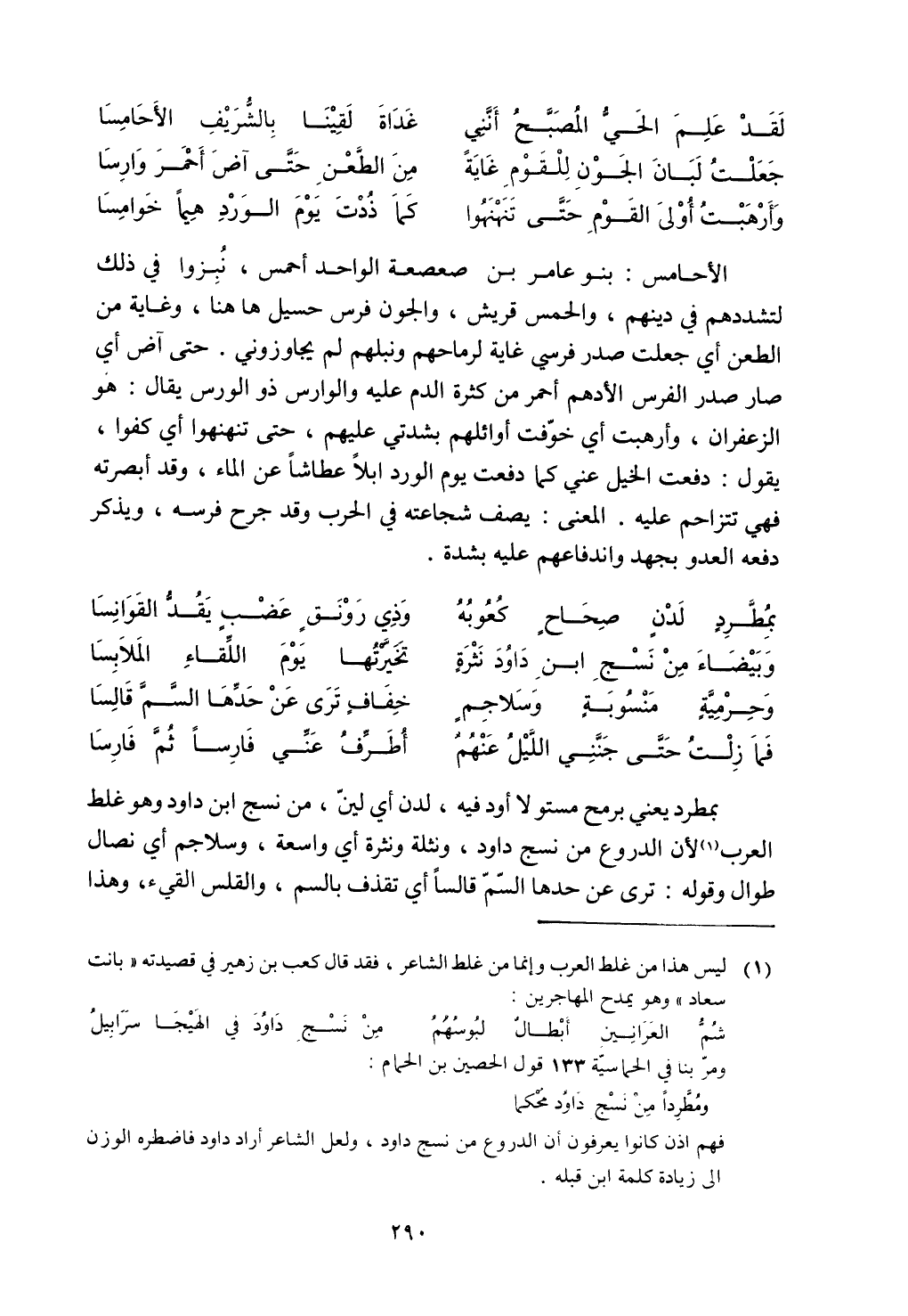 بمطرد يعني برمح مستو لا أود فيه، لدن أي لينّ، من نسج ابن داود وهو غلط العرب لأن الدروع من نسج داود، ونثلة ونثرة أي واسعة، وسلاجم أي نصال طوال وقوله: ترى عن حدها السم قالساً أي تقذف بالسم، والقلس القيء، وهذا