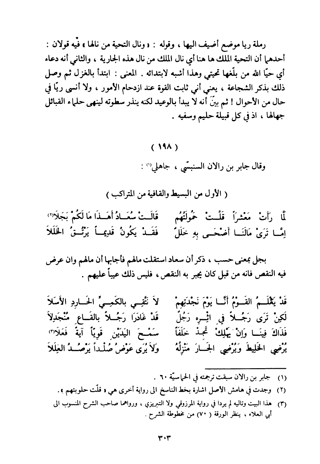 رملة ريا أضيف إليها، وقولة: ((ونال التحية من نالها)) فيه قولان: أحدهما: أن التحية الملك ها هنا أي نال الملك من نال هذه الجارية، والثاني: أنه دعاء أي حيا الله من بلغها تحيتي وهذا أشبة لابتدائه. المعني: ابتداء بالغزل ثم وصل ذلك بذكر الشجاعة، يعني أني ثابت القوة عند ازدحام الأمور، ولا أنسي ريا في حال من الأحوال! ثم بين أنة لا يبدأ بالوعيد لكنة ينذر سطوته لينهي حلماء القبائل جهالها، إذ في كل قبيلة حليم وسفيه.