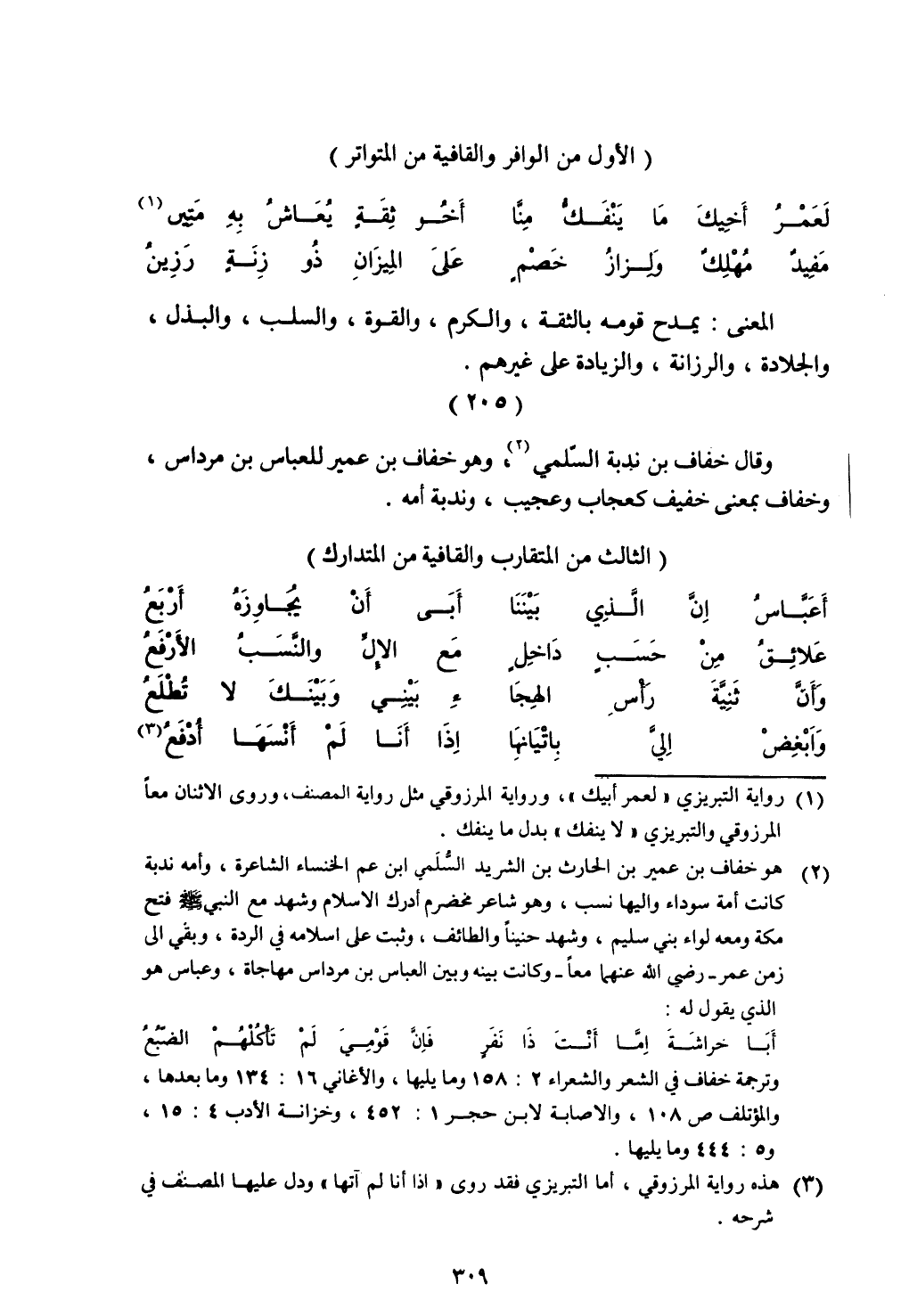 وقال خفاف بن ندبة السلمي، وهو خفاف بن عمير للعباس بن مرادس، وخفاف بمعني خفيف كعجاب وعجيب، وندبه أمه.