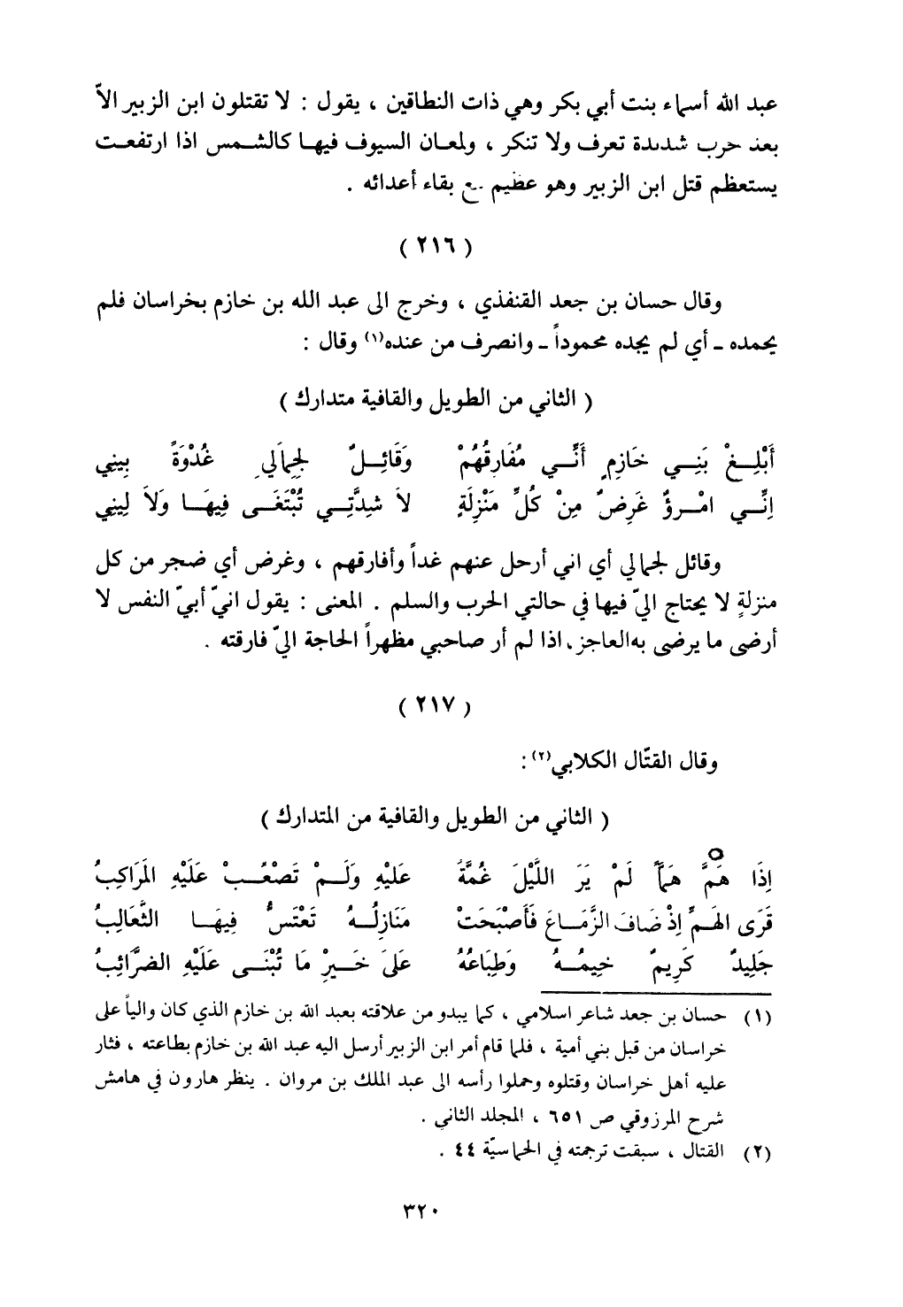 عبد الله أسماء بنت أبي بكر وهي ذات النطاقين، يقول: لا تقتلون ابن الزبير إلا بعد حرب شديدة تعرف ولا تنكر، ولمعان السيوف فيها كالشمس إذا ارتفعت يستعظم قتل ابن الزبير وهو عظيم مع بقاء أعدائه.