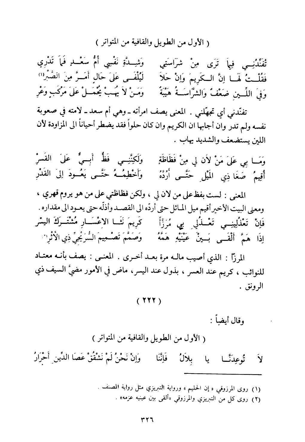تفندني أي تجهلني. المعنى يصف امرأته - وهي أم سعد - لامته في صعوبة نفسه ولم تدر وإن أجابها إن الكريم وإن كان حلوًا فقد يضطر أحيانًا إلى المزاودة لأنه اللين يستضعف والشديد يهاب.