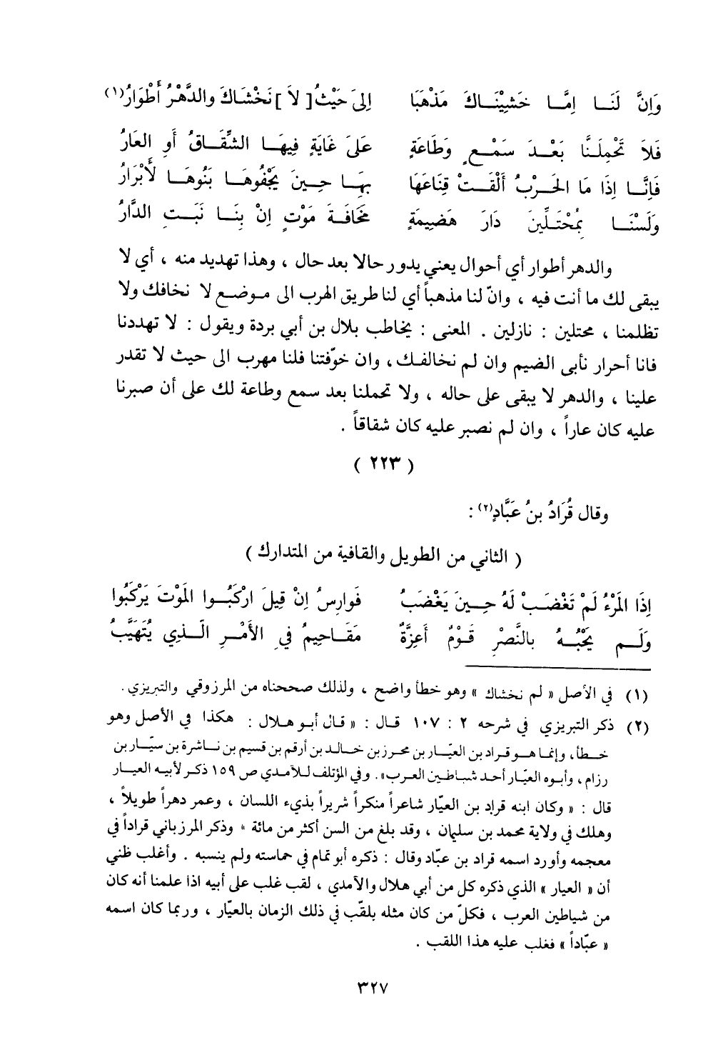 والدهر أطوار أي أحوال يعني يدور حالا بعد حال، وهذا تهديد منه، أي لا يبقى لك ما أنت فيه، وإن لنا مذهبًا أي لنا طريق الهرب إلى موضع لا نخافك ولا تظلمنا، محتلين: نازلين. المعنى: يخاطب بلال بن أبي بردة ويقول: لا تهددنا فإنا أحرار نأبي الضيم وإن لم نخالفك، وإن خوفتنا فلنا مهرب إل حيث لا تقدر علينا، والدهر لا يبقى على حاله، ولا تحملنا بعد سمع وطاعة لك على أن صبرنا عليه كان عارا، وإن لم نصبر عليه كان شقاقا.