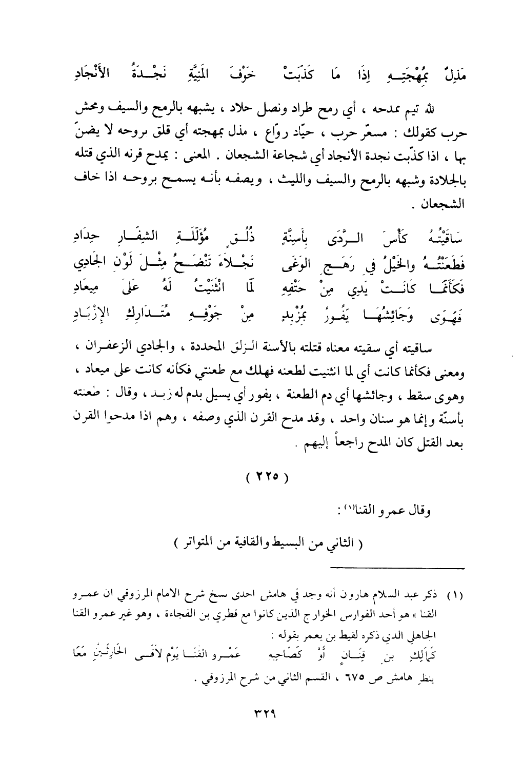 لله تيم يمدحه، أي رمح طراد ونصل حلاد، يشبهه بالرمح والسيف ومحش حرب كقولك: مسعر حرب، وحياد رواع، مذل بمهجته أي قلق بروحه لا يضن بها، إذا كذبت نجدة الأنجاد أي شجاعة الشجعان. المعني: يمدح قرنه الذي قتله بالجلادة وشبهه بالرمح والسيف الليث، ويصفه بأنه يسمح بروحه إذا خاف الشجعان.