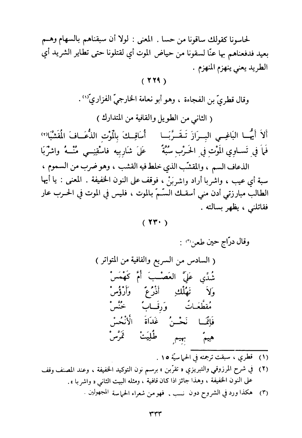 الذعاف السم، والمقشب الذي خلط فيه القشب، وهو ضرب من السموم، سبة أي عيب، واشربا أراد واشربن، فوقف على النون الخفيفة. المعنى: يا أيها الطالب مبارزتي أدن مني أسقك السم بالموت، فليس في الموت في الحرب عار فقاتلني، يظهر بسالته.