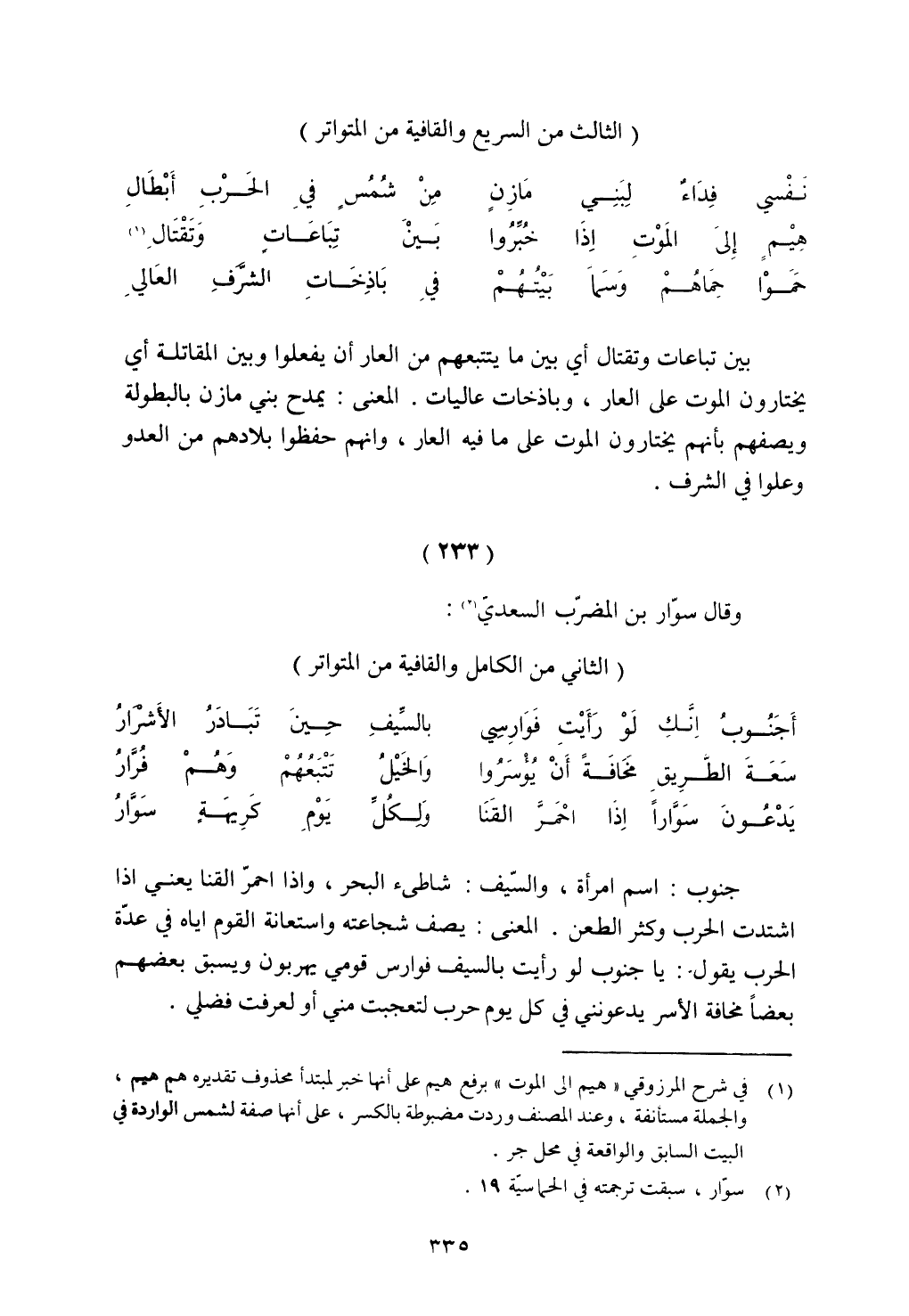 بين تباعات وتقتال أي بين ما يتتبعهم من العار أن يفعلوا وبين المقاتلة أي يختارون الموت على العار، وباذخات عاليات. المعنى: يمدح بني مازن بالبطولة ويصفهم بأنهم يختارون الموت على ما فيه العار، وأنهم حفظوا بلادهم من العدو وعلوا في الشرف.