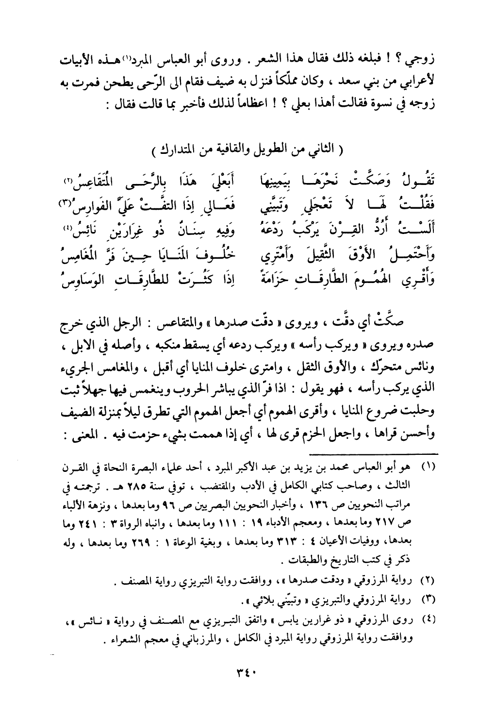 زوجي؟ ! فبلغه ذلك فقال هذا الشعر. وروى أبو العباس المبرد هذه الأبيات لأعرابي من بني سعد، وكان مملكًا فنزل به ضيف فقام إلى الرحى يطحن فمرت به زوجه في نسوة فقالت أهذا بعلي؟ ! أعظامًا لذلك فأخبر بما قالت فقال: