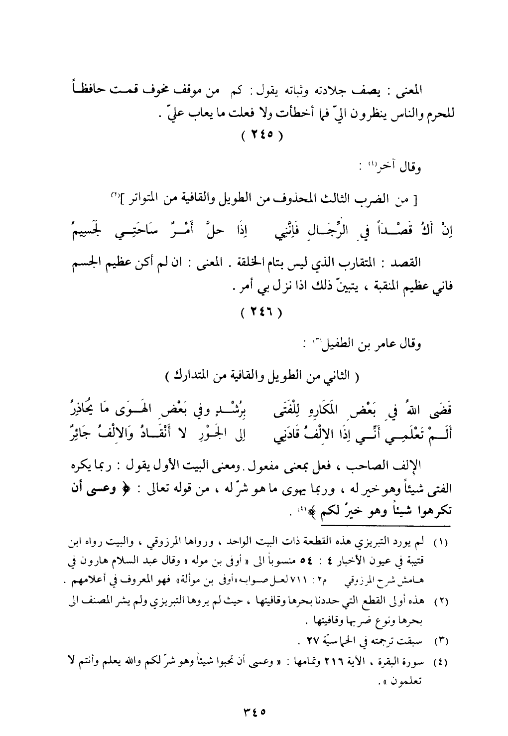 الإلف الصاحب، فعل بمعنى مفعول. ومعنى البيت الأول يقول: ربما يكره الفتي شيئاً وهو خير له، وربما يهوى ما هو شر له، من قوله تعالي: {وَعَسَى أَن تَكْرَهُوا شَيْئاً وَهُوَ خَيْرٌ لَّكُمْ}.