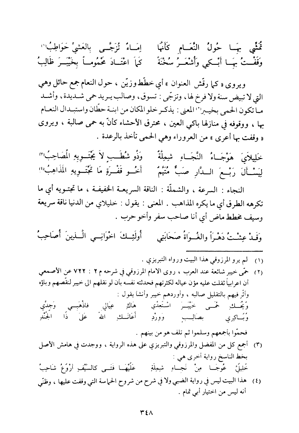 ويروى "كما رقش العنوان" أي خطط وزين، حول النعام جمع حائل وهي التي لا تبيض سنة ولا فرخ لها، وتزجى: تسوق، وصالب يريد حمى شديدة، وأشد ما تكون الحمى بخيبر المعنى: يذرك خلو المكان من ابنة حطان واستبدال النعام بها، ووقوفه في منازلها باكي العين، محترق الأحشاء كأن به حمى صالبة، ويروى "وقفت بها أعرى" من العروراء وهي الحمى تأخذه بالرعدة.