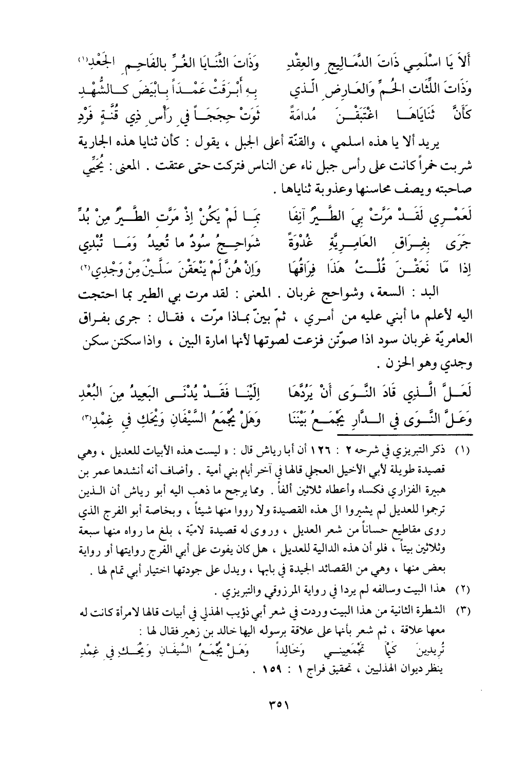 البد: السعة، وشواحج غربان. المعنى: لقد مرت بي الطير بما احتجت إلهي لأعلم ما أبني عليه من أمري، ثم بين بماذا مرت، فقال: جرى بفراق العامرية غربان سود إذا صوتن فزعت لصوتها لأنها إمارة البيت، وإذا سكتن سكن وجدي وهو الحزن.