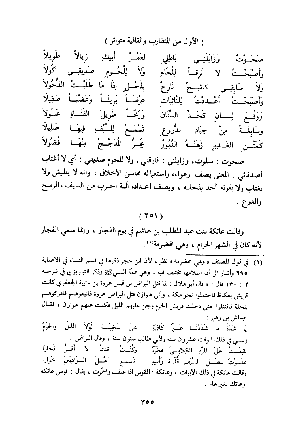 وقالت عاتكة بنت عبد المطلب بن هاشم في يوم الفجار، وإنما سمي الفجار لأنه كان في الشهر الحرام، وهي مخضرمة: