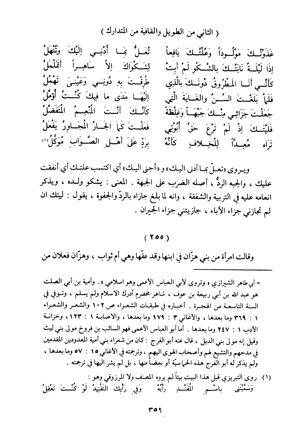ويروى "تعل بما أدنى إليك" و"أجنى إليك" أي اكتسب علتك أي أنفقت عليك، والجبة الرد، أصله الضرب على الجبهة. المعنى: يشكو ولده، ويذكر أنعامه عليه في التربية والشفقة، وأنه لما بلغ جازاه بالرد والجفوة، يقول: ليتك إن لم تجازني جزاء الآباء، جازيتني جزاء الجيران.