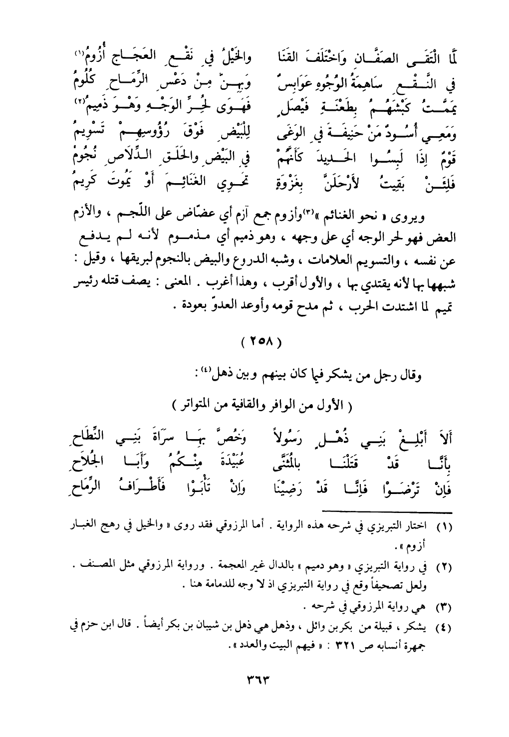 ويروى "نحو الغنائم" وأزوم جمع آزم أي عضاض على اللجم، والأزم العض فهو لحر الوجه أي على وجهه، وهو ذميم أي مذموم لأنه لم يدفع عن نفسه، والتسويم العلامات، وشبه الدروع والبيض بالنجوم لبريقها، وقيل: شبهها بها لأنه يقتدي بها، والأول أقرب، وهذا أغرب. المعنى: يصف قتله رئيس تميم لما اشتدت الحرب، ثم مدح قومه وأوعد العدو بعودة.