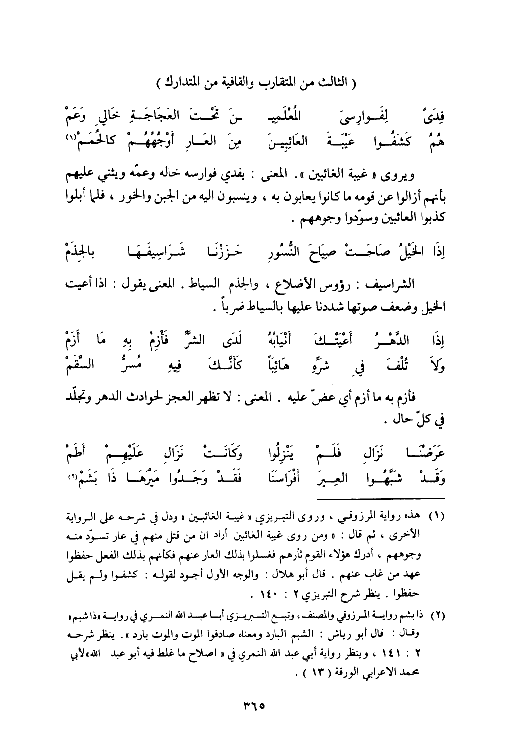 ويروي "غيبة الغائبين". المعنى: يفدي فوارسه خاله وعمه ويثني عليهم بأنهم أزالوا عن قومه ما كانوا يعابون به، وينسبون إليه من الجبن والخور، فلما أبلوا كذبوا العائبين وسودوا وجوههم.