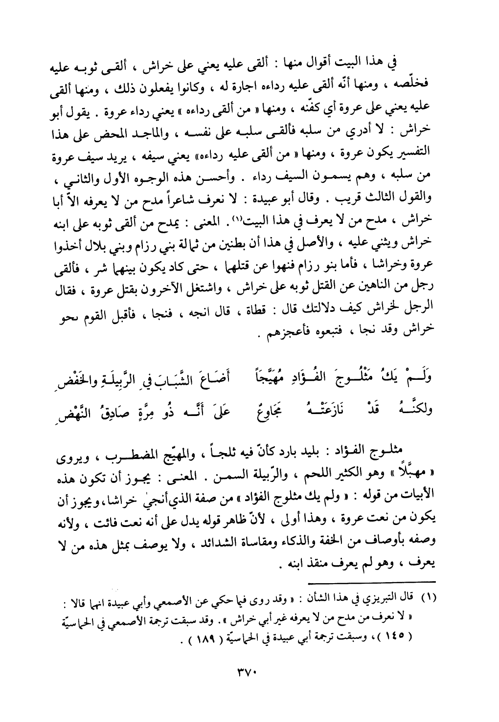 في هذا البيت أقوال منها: ألقى عليه يعني على خراش، ألقى ثوبه عليه فخلصه، ومنها أنه ألقى عليه رداءه إجارة له، وكانوا يفعلون ذلك، ومنها ألقى عليه يعني على عروة أي كفنه، ومنها "من ألقى رداءه" يعني رداء عروة. يقول أبو خراش: لا أدري من سلبه فألقى سلبه على نفسه، والماجد المحض على هذا التفسير يكون عروة، ومنها "من ألقى عليه رداءه" يعني سيفه، يريد سيف عروة من سلبه، وهم يسمون السيف رداء. وأحسن هذه الوجوه الأول والثاني، والقول الثالث قريب. وقال أبو عبيدة: لا نعرف شاعراً مدح من لا يعرفه إلا أبا خراش، مدح من لا يعرف في هذا البيت. المعنى: يمدح من ألقى ثوبه على ابنه خراش ويثني عليه، والأصل في هذا أن بطنين من ثمالة بني رزام وبني بلال أخذوا عروة وخراشا، فأما بنو رزام فنهوا عن قتلهما، حتى كاد يكون بينهما شر، فألقى رجل من الناهين عن القتل ثوبه على خراش، واشتغل الآخرون بقتل عروة، فقال الرجل لخراش كيف دلالتك قال: قطاة، قال انجه، فنجا، فأقبل القوم نحو خراش وقد نجا، فتبعوه فأعجزهم.