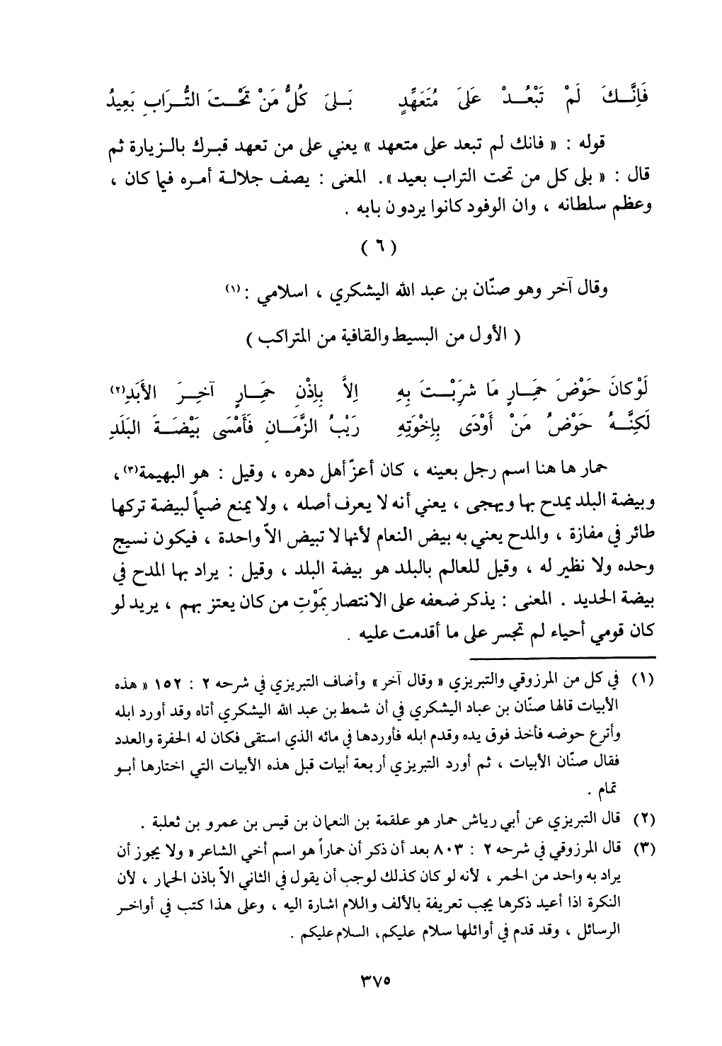 حمار ها هنا اسم رجل بعينه، كان أعز أهل دهره، وقيل: هو البهيمة، وبيضة البلد يمدح بها ويهجى، يعني أنه لا يعرف أصله، ولا يمنع ضيماً لبيضة تركها طائر في مفازة، والمدح يعني به بيض النعام لأنها لا تبيض الا واحدة، فيكون نسيج وحده ولا نظير له، وقيل للعالم بالبلد هو بيضة البلد، وقيل: يراد بها المدح في بيضة الحديد. المعنى: يذكر ضعفه على الانتصار بموت من كان يعتز بهم، يريد لو كان قومي أحياء لم تجسر على ما أقدمت عليه.