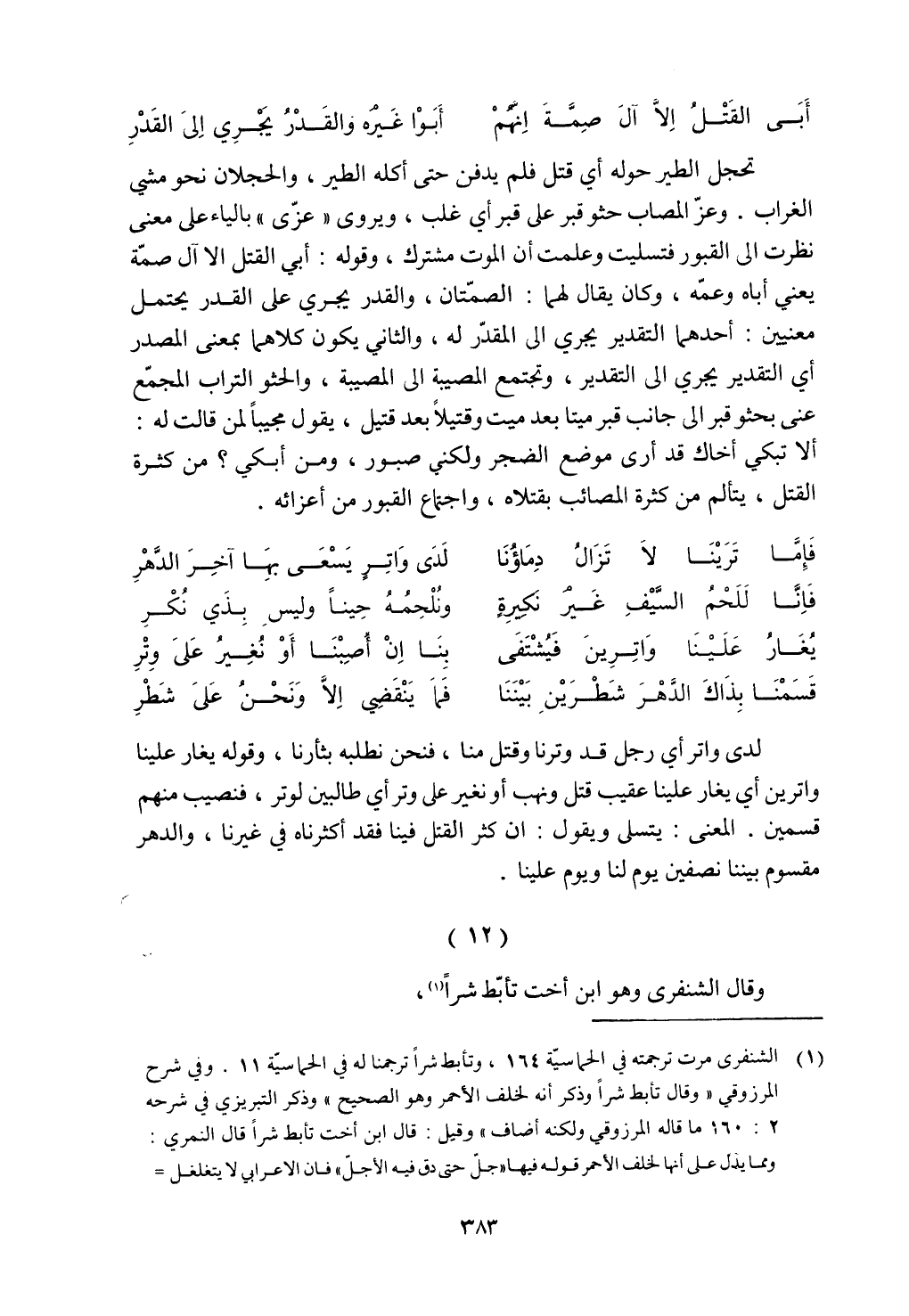 تحجل الطير حوله أي قتل فلم يدفن حتى أكله الطير، والحجلان نحو مشي الغراب. وعز المصاب حثو قبر على قبر أي غلب، ويروى ((عزى)) بالياء على معني نظرت الى القبور فتسليت وعملت أن الموت مشترك، وقوله: أبي القتل الا آل صمة يعني أباه وعمه، وكان يقال لهما: الصمتان، والقدر يجري على القدر يحتمل معنيين: أحدهما التقدير يجري إلى المقدر له، والثاني يكون كلاهما بمعنى المصدر أي التقدير يجري إلى التقدير، وتجتمع المصيبة إلى المصيبة، والحثو التراب المجمع ألا تبكي أخاك قد أري موضع الضجر ولكنى صبور، ومن أبكي؟ من كثرة القتل، يتألم من كثرة المصائب بقتلاه، واجتماع القبور من أعزاءه.
