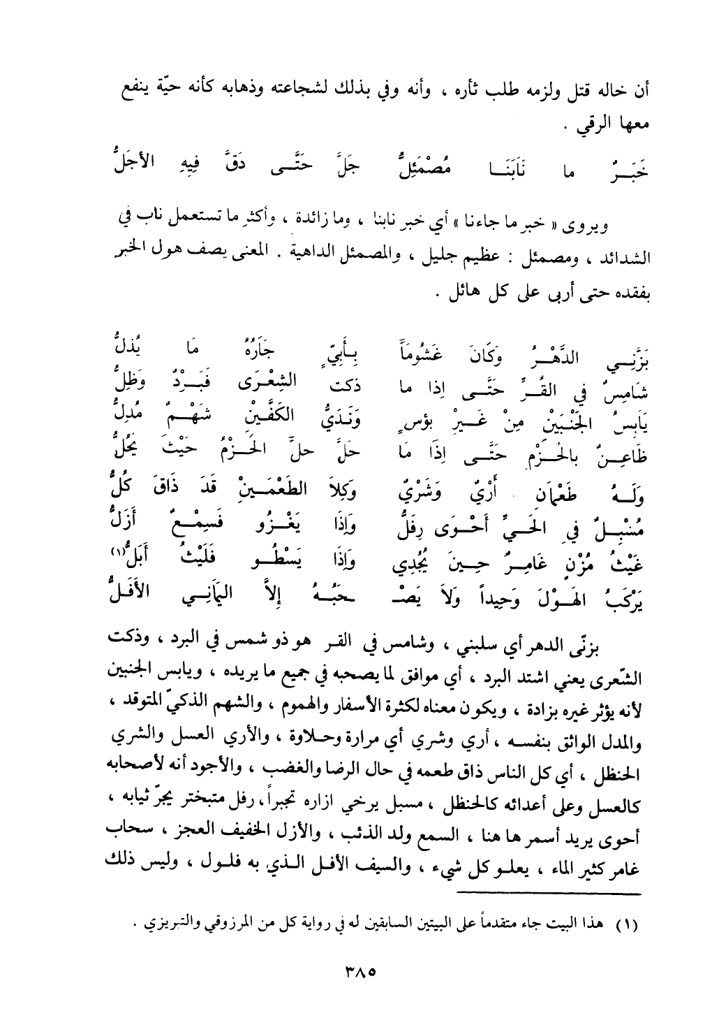 بزني الدهر أي سنبلي، وشامس في القر هو ذو شمس في البرد، أي مرارة وحلاوة، والأري العسل والشرى الحنظل، أي كل الناس ذاق طعمه في حال الرضا والغضب، والأجود أنه لأصحابه كالعسل وعاي أعدائه كالحنظل، مسبل يرخي ازاره تجبراً، رفل متبختر يجر ثيابه، أحوي يريد أسمر هاهنا، السمع ولد الذئب، والأزل الخفيف العجز، سحاب غامر كثير الماء، يعلو كل شيء، والسيف الأفل الذي به فلول، وليس ذلك