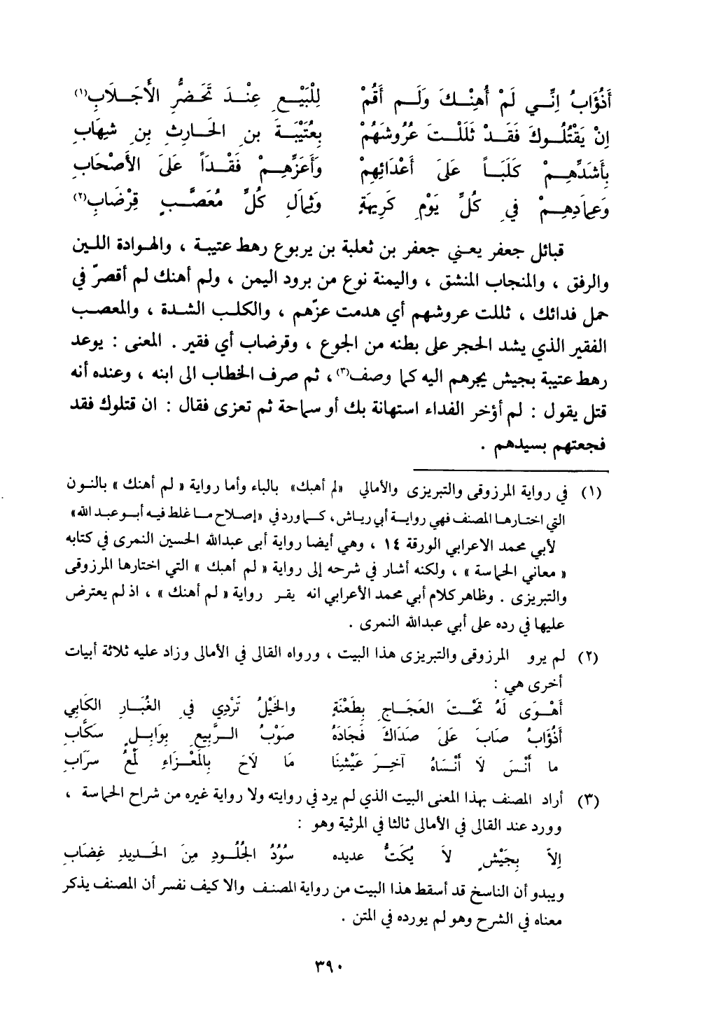 قبائل جعفر يعني بن ثعلبة بن يربوع رهط عتيبة، والهوادة اللين والرفق، والمنجاب المنشق، واليمنة نوع من برود اليمن، ولم أهنك لم أقصر في حمل فدائك، ثللث عروشهم أي هدمت عزهم، والكلب الشدة، والمعصب الفقير الذي يشد الحجر علي بطنه من الجوع، وقرضاب أي فقير. المعني: يوعد رهط عتيبة بجيش يجرهم إليه كما وصف، ثم صرف الخطاب إلي أبنه، وعنده أنه قتل يقول، لم أوخر الفداء استهانة بك أو سماحة ثم تعزي فقال: إن قتلوك فقد فجعتهم بسيدهم.