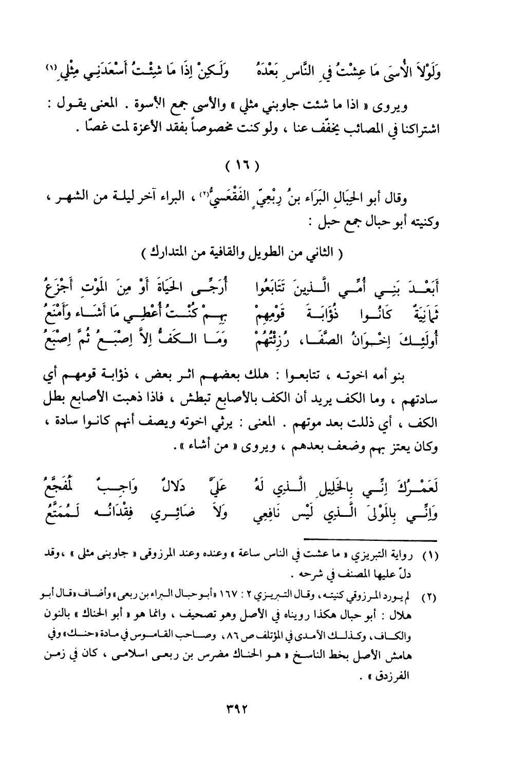 بنو أمه إخوته، تتابعوا: هلك بعضهم اثر بعض، ذؤابه قومهم أي سادتهم، وما الكف بالأصابع تبطش، فإذا ذهبت الأصابع بطل الكف، أي ذللت بعد موتهم. المعني: يرثي إخوته ويصف أنهم كانوا سادة، وكان يعتز بهم وضعف بعدهم، ويروي "من أشاء".
