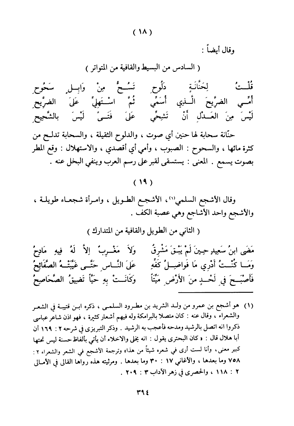 حنانة لها حنين أي صوت، والدلوح الثقيلة، والسحابة تدحل من كثرة مائها، والسحوح: الصبوب، وأمي أي أقصدي، والاستهلال: وقع المطر بصوت يسمع. المعني: يستسقي لقبر علي رسم العرب وينفي البخل عنه.