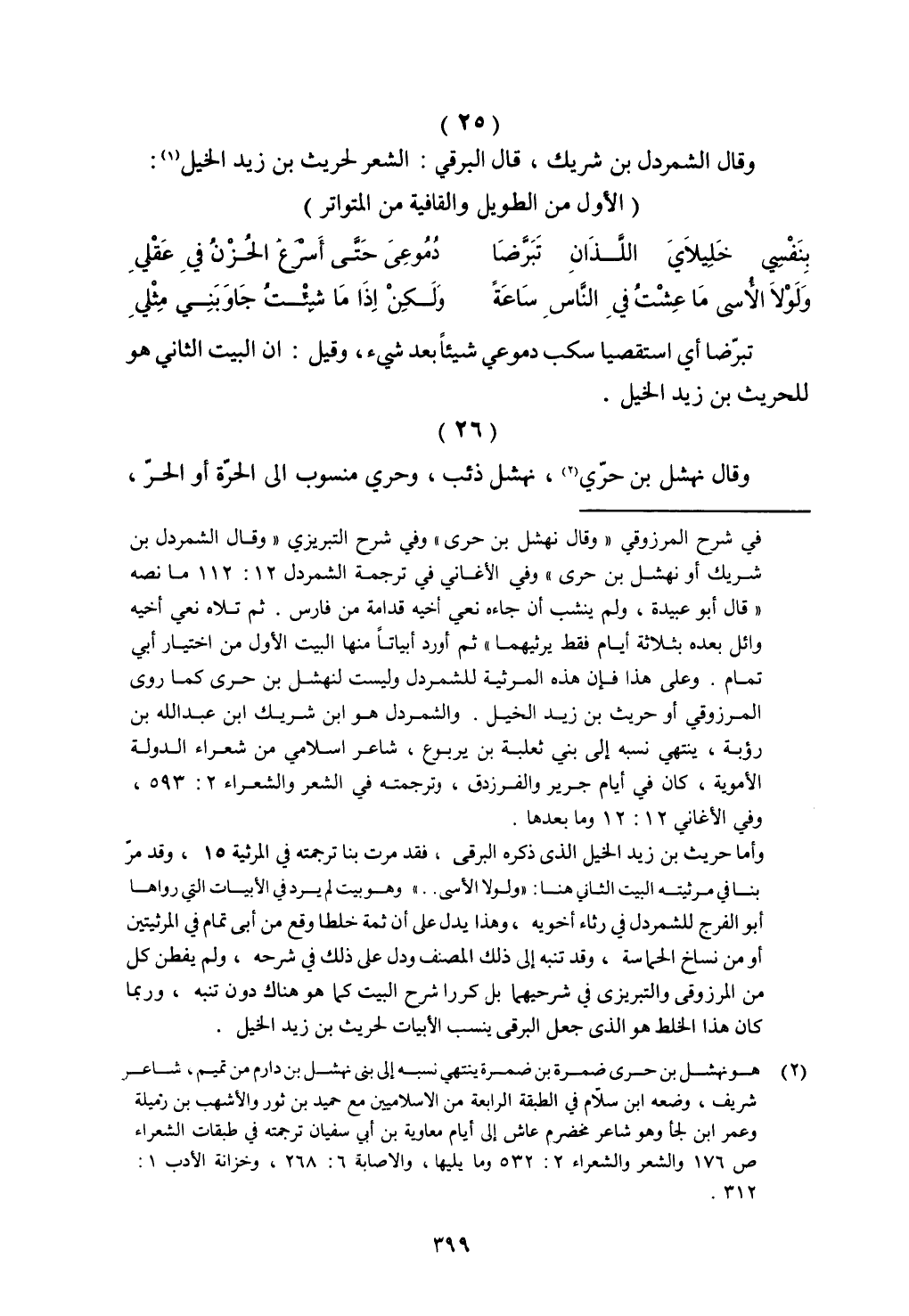 وقال الشمردل بن شريك، قال البرقي: الشعر لحريث بن زيد الخيل: